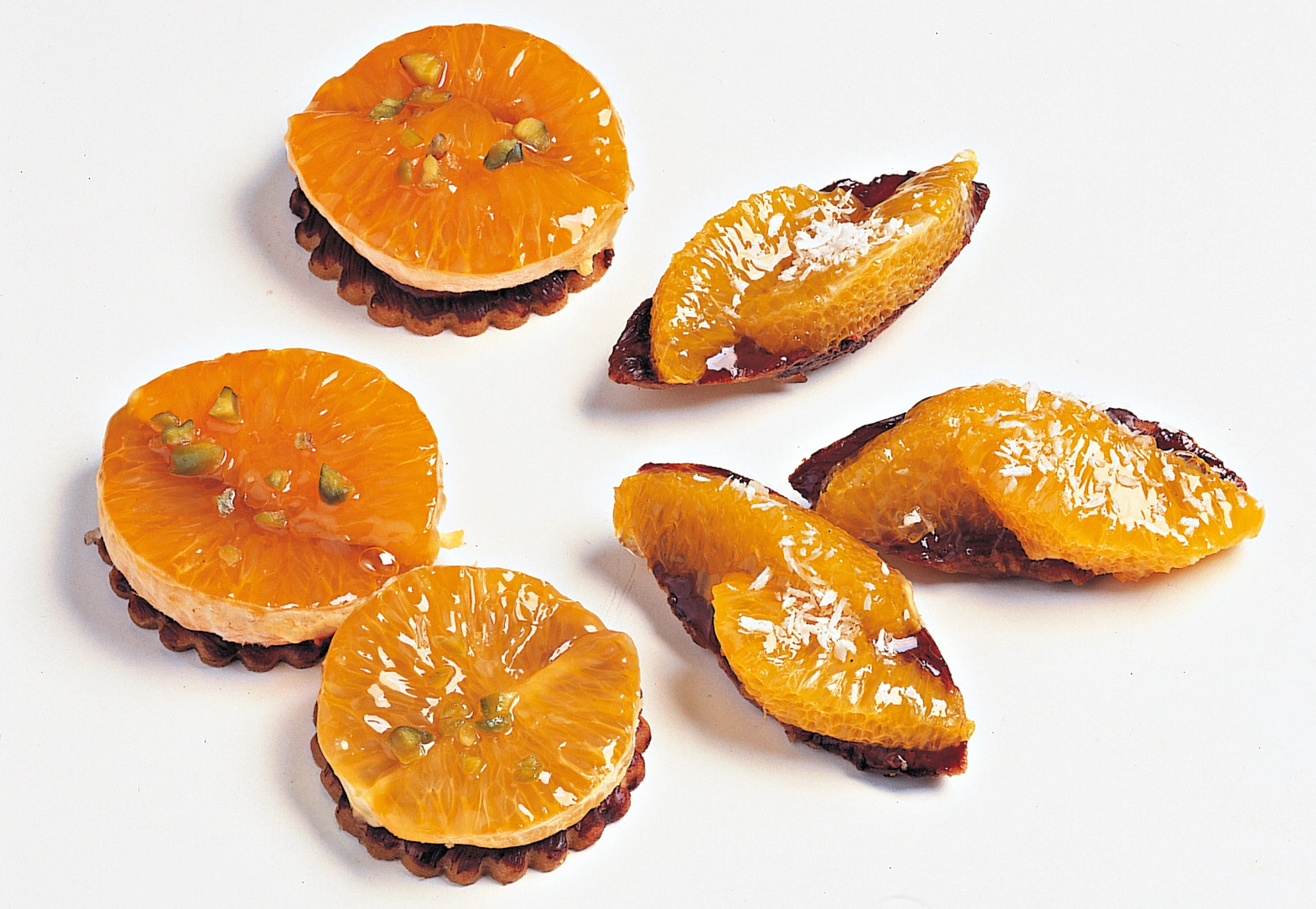 Runde Kekse mit je einer Orangenscheibe, ovale Kekse mit je zwei Mandarinenenfilets belegen. Tortengelee laut Anweisung zubereiten, die Früchte damit dünn bestreichen und eventuell mit gehackten Pistazien oder Kokosett bestreuen.