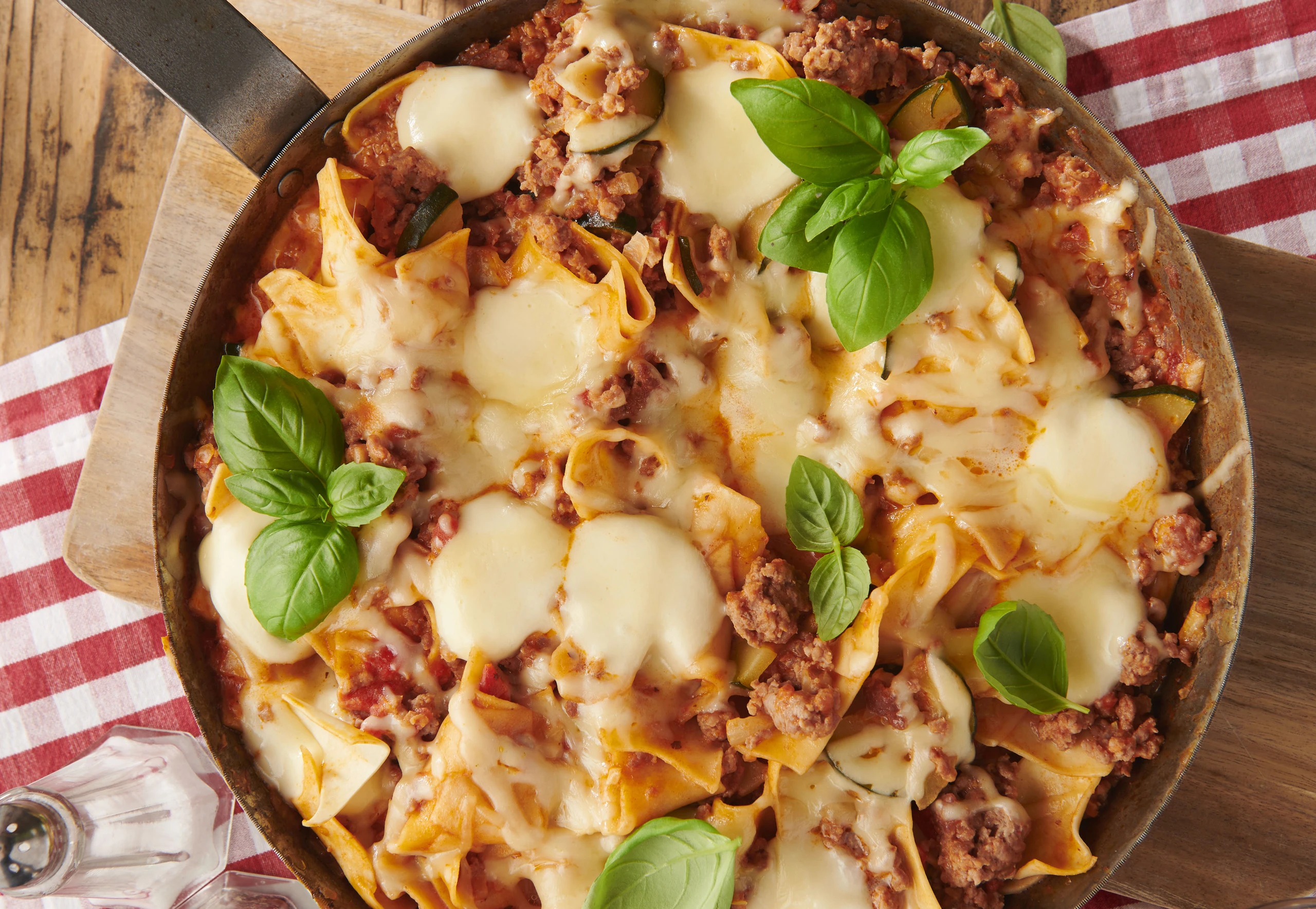 Mozzarella und Gouda auf der Lasagne verteilen und weitere 5 Minuten zugedeckt köcheln. Lasagne mit Basilikumblättern garnieren und in der Pfanne servieren.