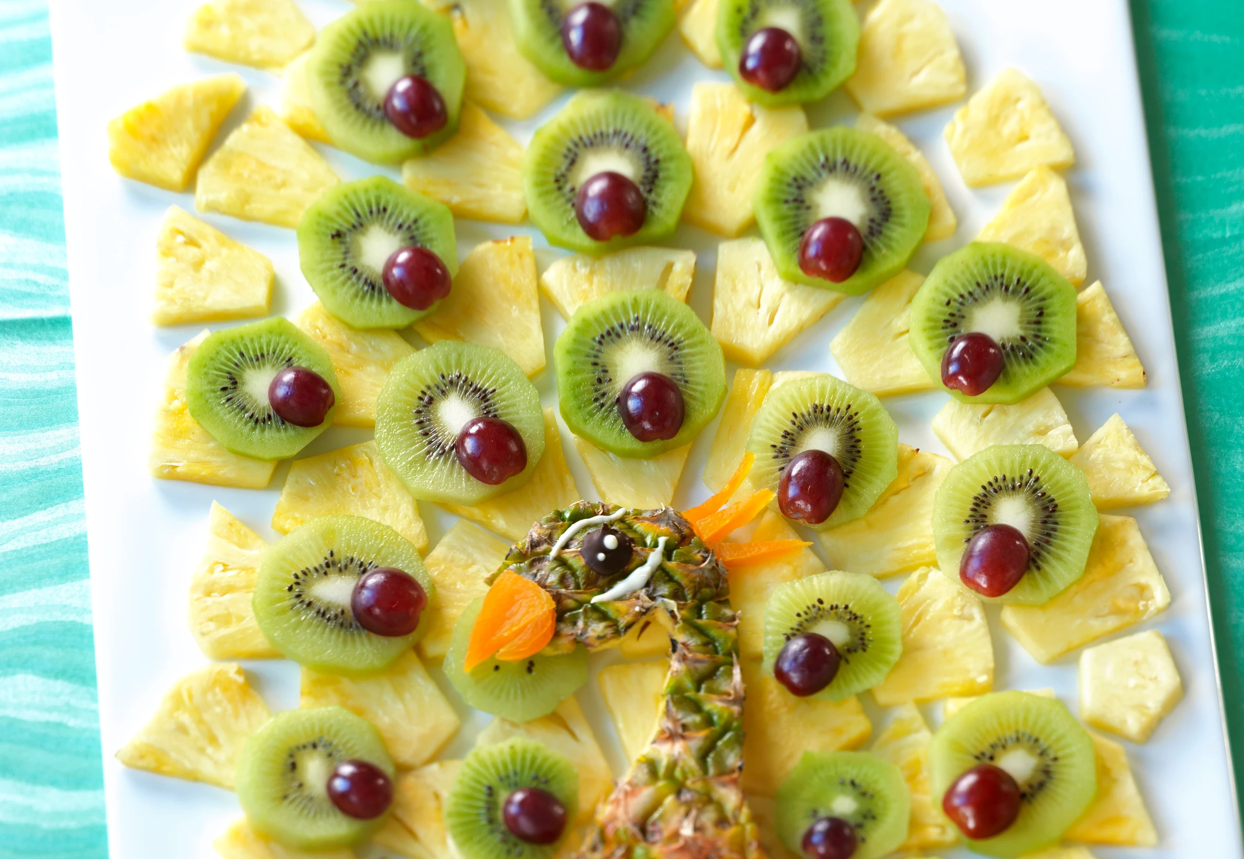 - Ananas achteln, den Strunk entfernen, Ananas in Stücke schneiden. Stücke fächerförmig um den Körper des Pfaus drapieren.