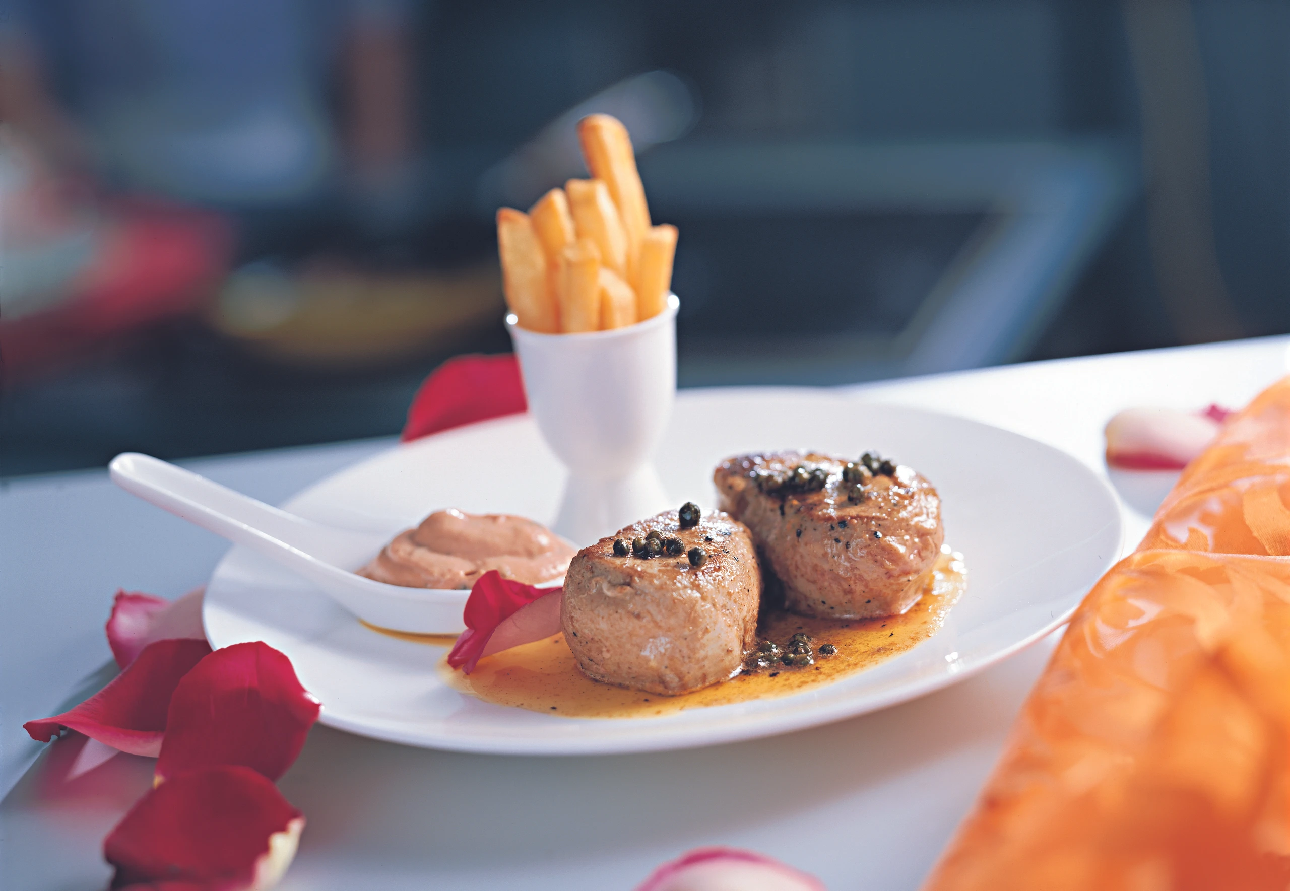 Medaillons aus der Pfanne nehmen und warm stellen. Butter in den Bratrückstand rühren, abgetropften grünen Pfeffer zugeben. Medaillons darin schwenken.