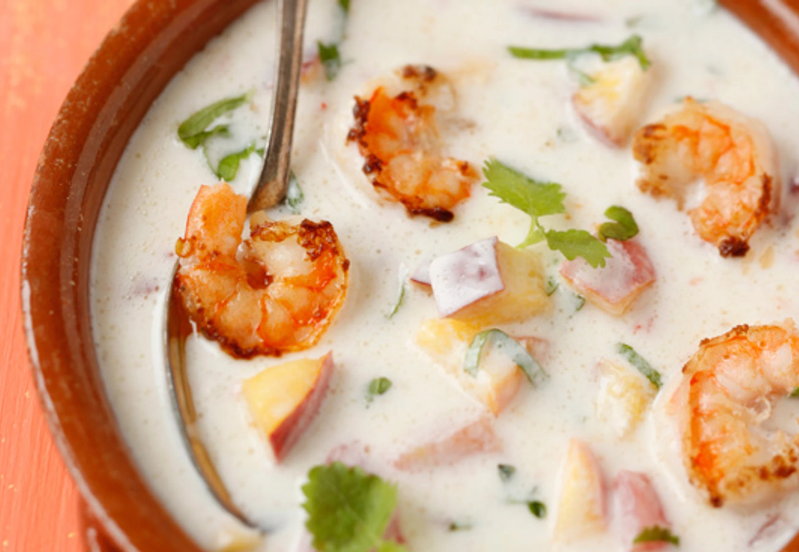 Suppe anrichten, Garnelen darin verteilen, eventuell mit Zitronenmelisse garniert servieren.