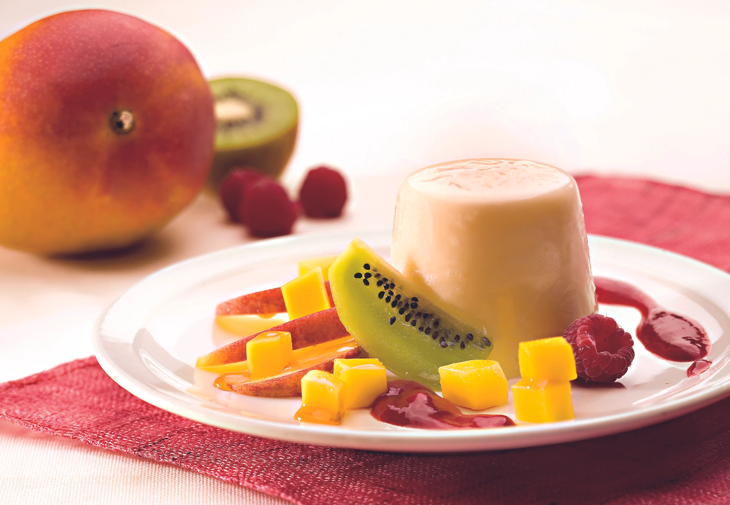 Förmchen kurz in heißes Wasser tauchen. Mousse auf Teller stürzen, mit Fruchtsalat, Himbeersauce, und -püree garnieren.