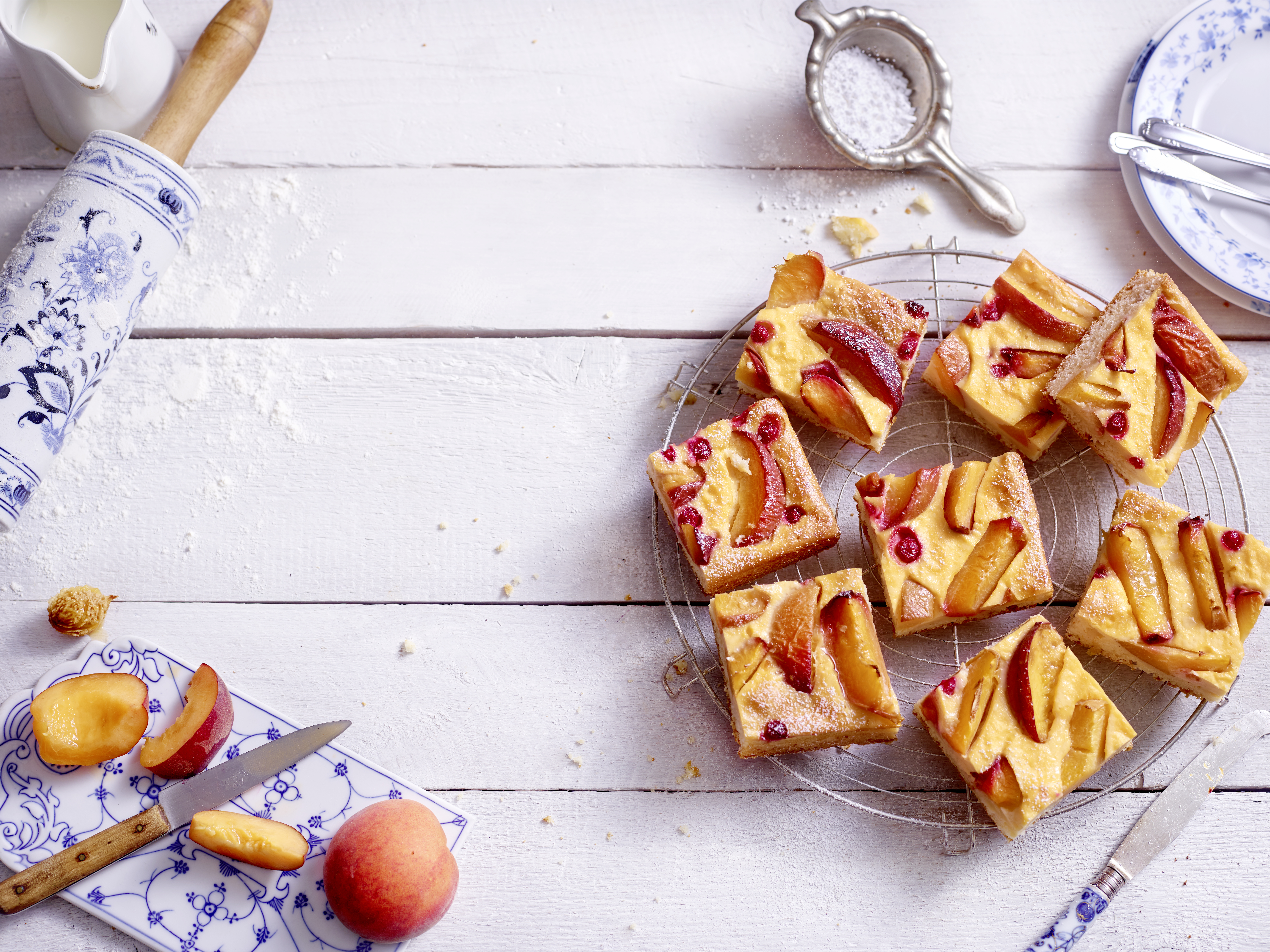 Rohr auf 180°C vorheizen. Backblech oder eine Rahmenform (32 x 39 cm) mit Backpapier auslegen. Pfirsiche halbieren, entsteinen und in Spalten schneiden. Ribiseln von den Rispen zupfen.