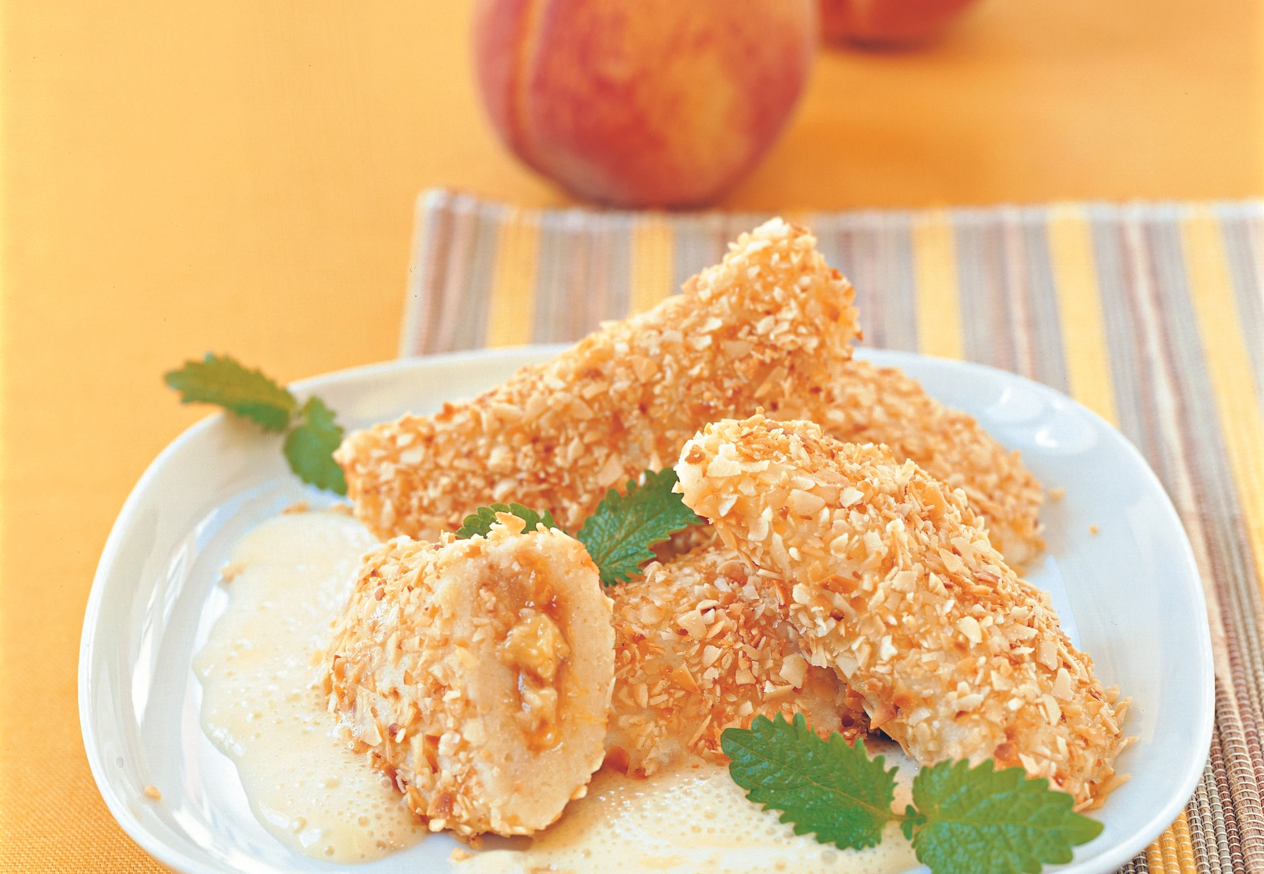 Tascherln herausheben, abtropfen lassen und in den übrigen Mandeln wälzen. Mit der Sauce anrichten, mit Staubzucker bestreuen, mit Melisse garnieren.