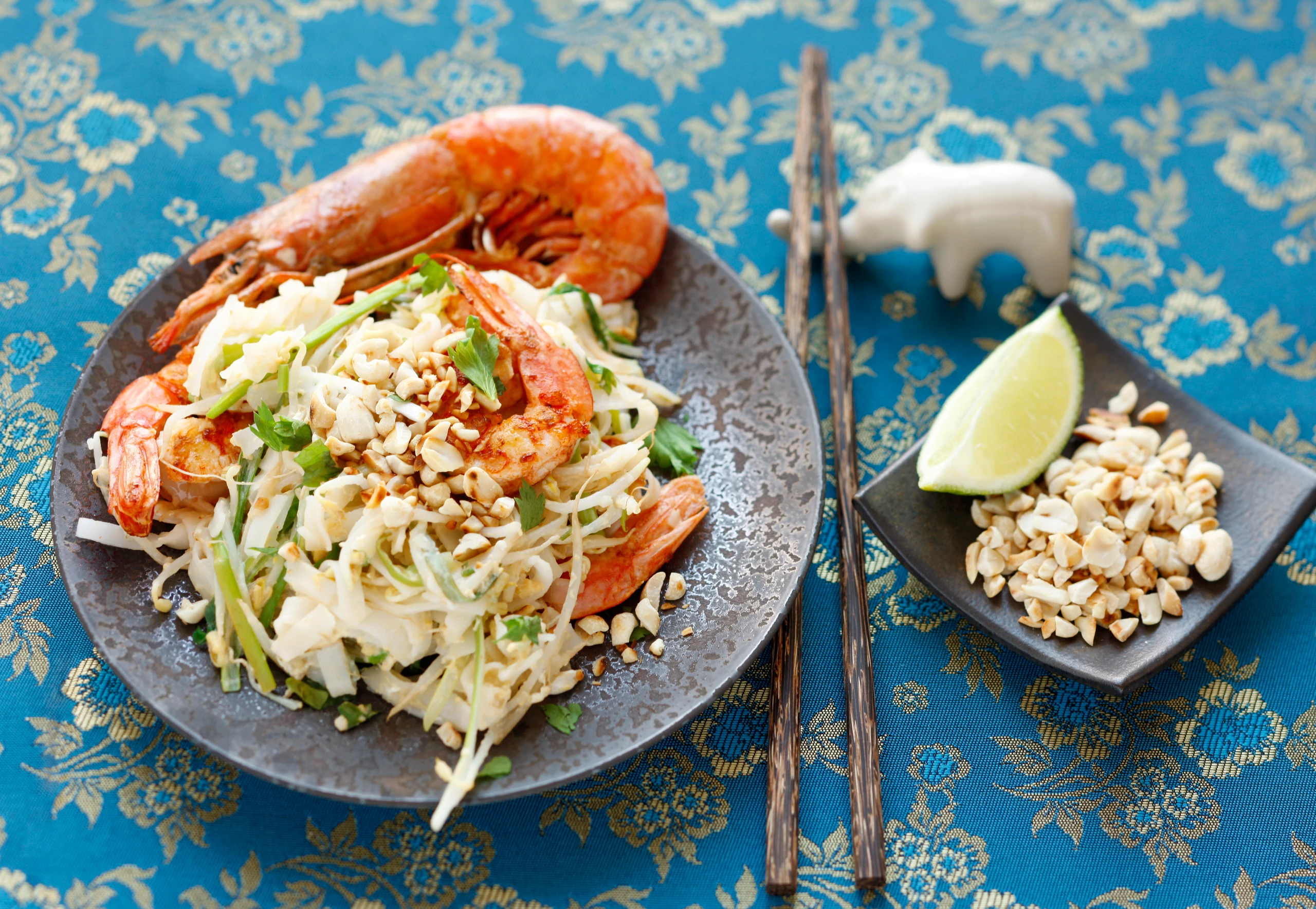 Öl im Wok erhitzen. Garnelen und Knoblauch darin anbraten, mit Fischsauce ablöschen. Nudeln und Eier zugeben und unter Rühren braten, bis die Eier stocken. Jungzwiebeln und Sojasprossen untermischen und erhitzen. Phad Thai mit Erdnüssen und Petersilie bestreut servieren.