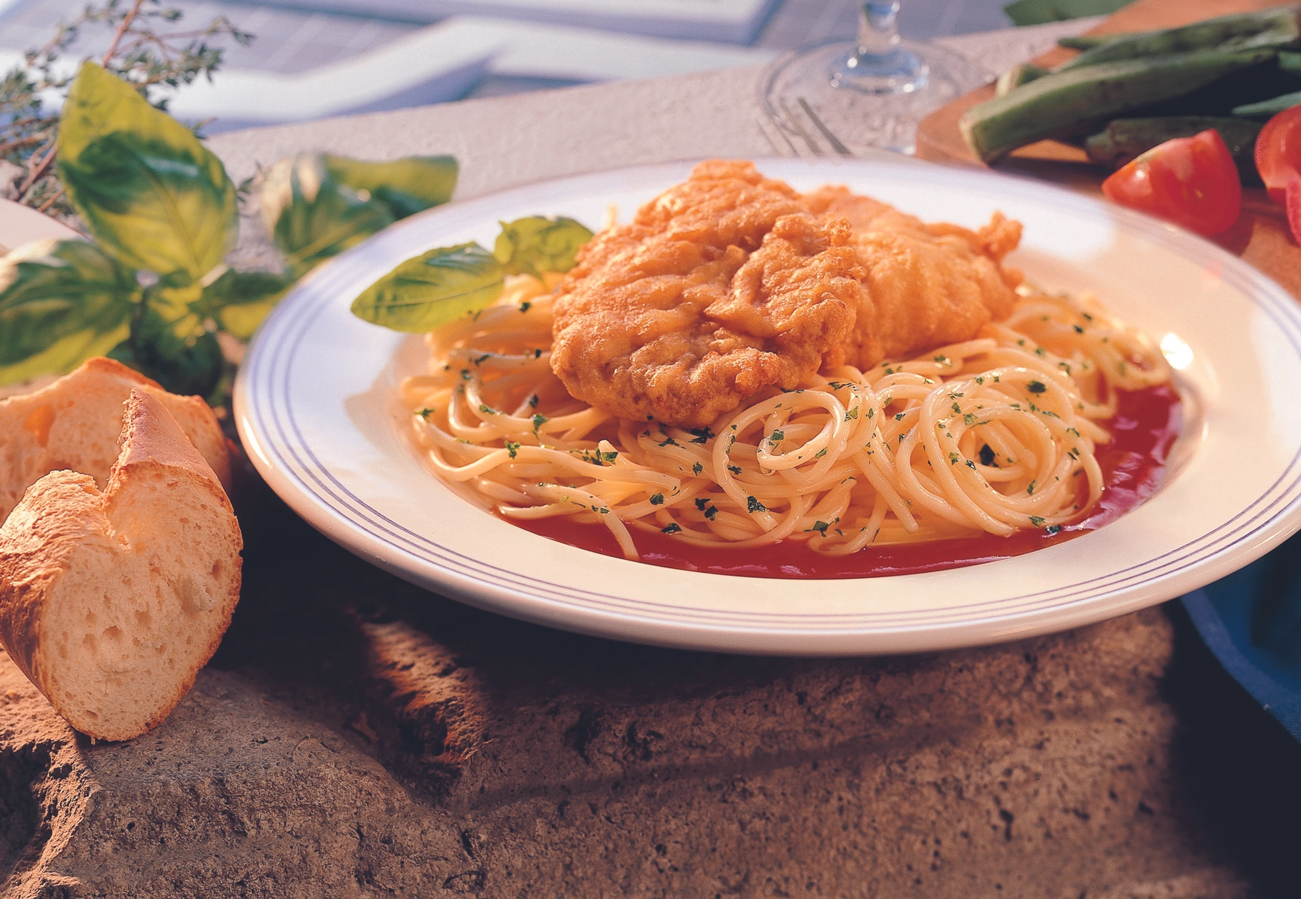Piccata alla milanese mit Butter-Spaghetti und Paradeissauce