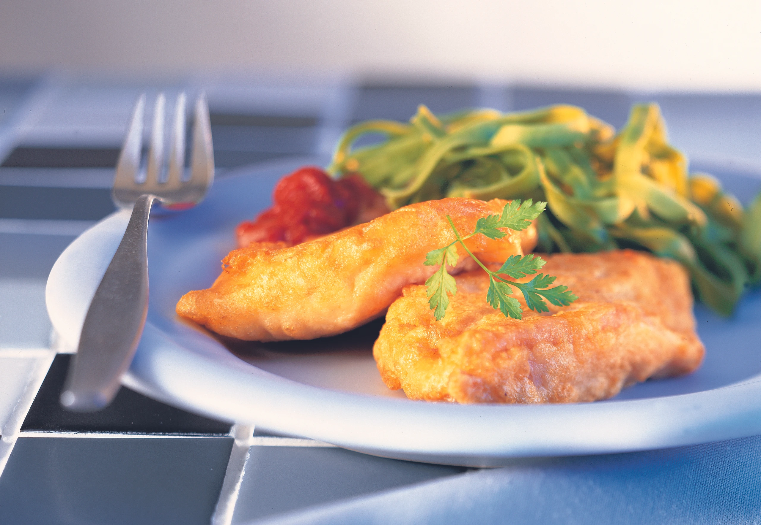 Gebackene Fischstücke mit der Sauce auf Tellern anrichten. Als zusätzliche Beilage passen grüne Nudeln.