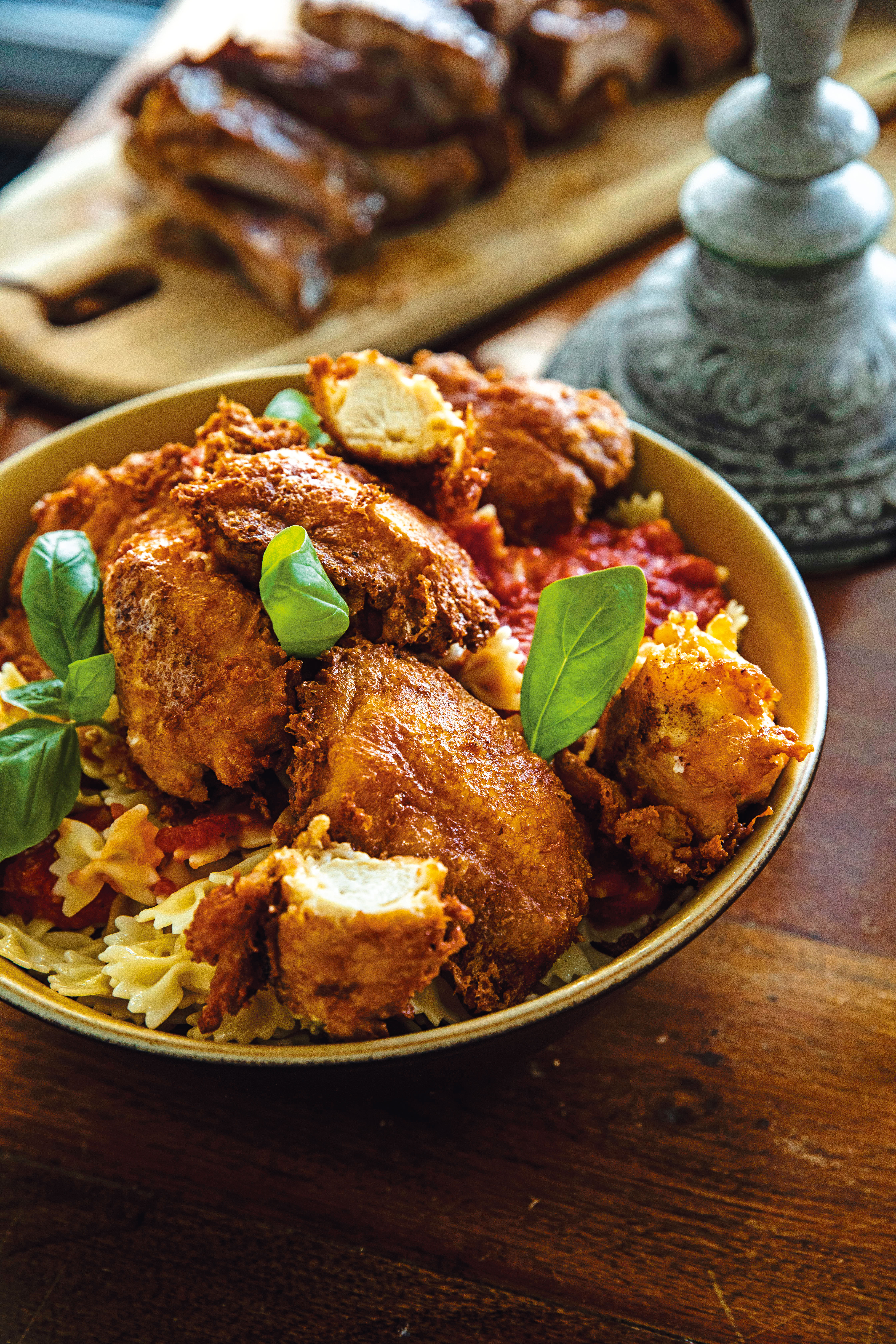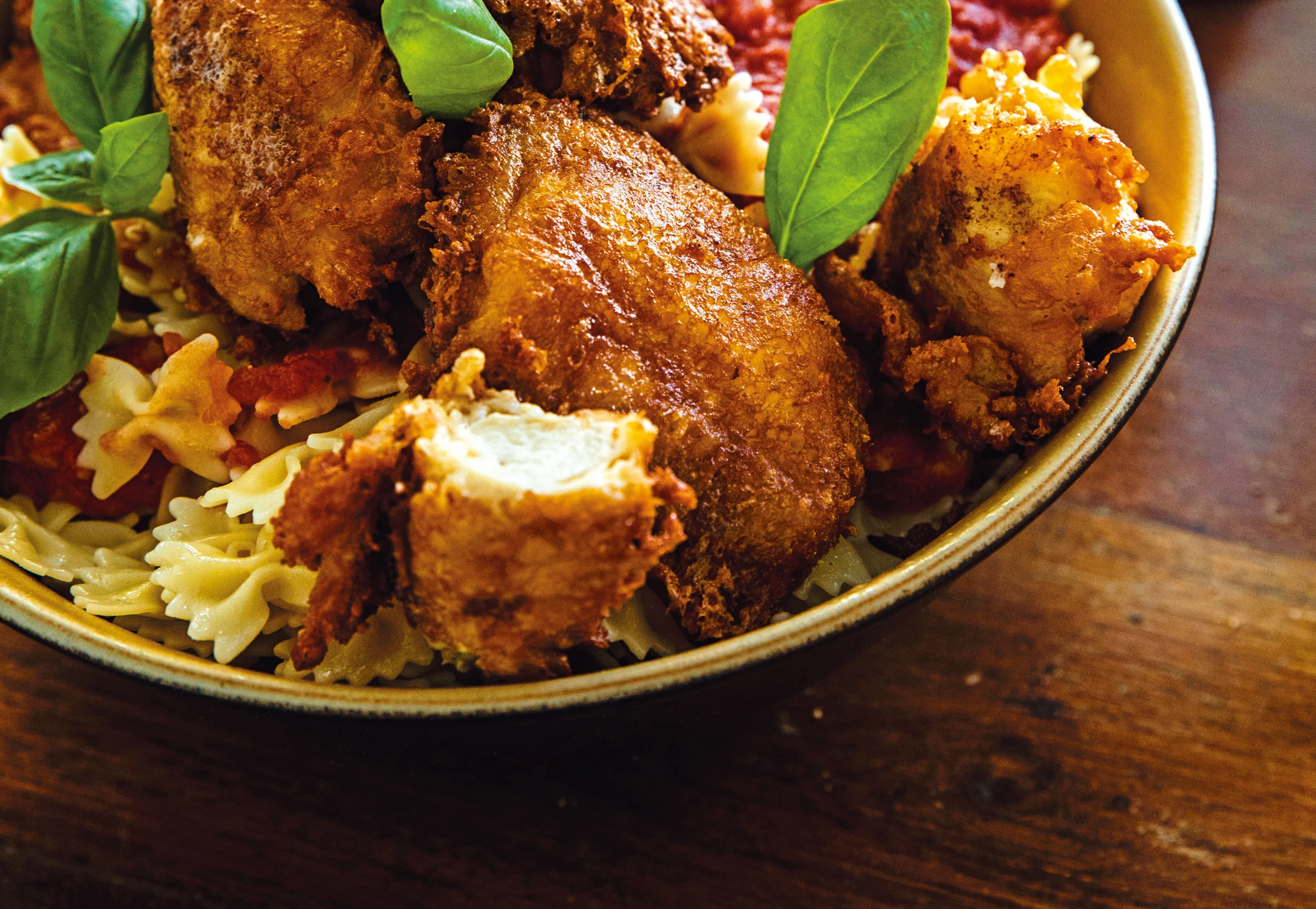 Pasta mit der Paradeissauce vermischen, mit den Hühnerstücken anrichten und mit Basilikum bestreuen.