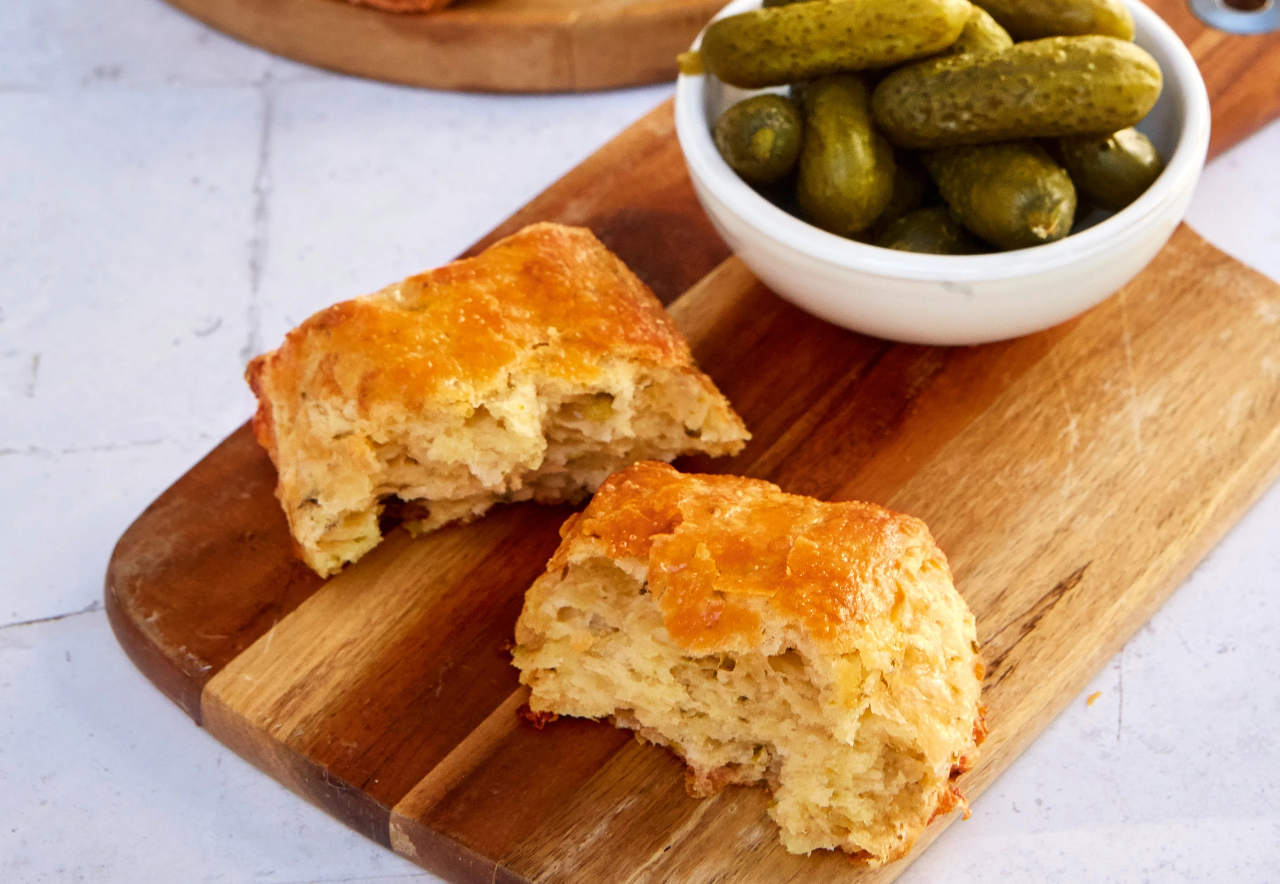 - Mehl, Backpulver und Salz in eine Schüssel geben und vermischen. Butter in grobe (ca. 2 cm), Essiggurken in sehr feine Würfel schneiden. Mit Essiggurkenwasser und Buttermilch zur Mehlmischung geben.