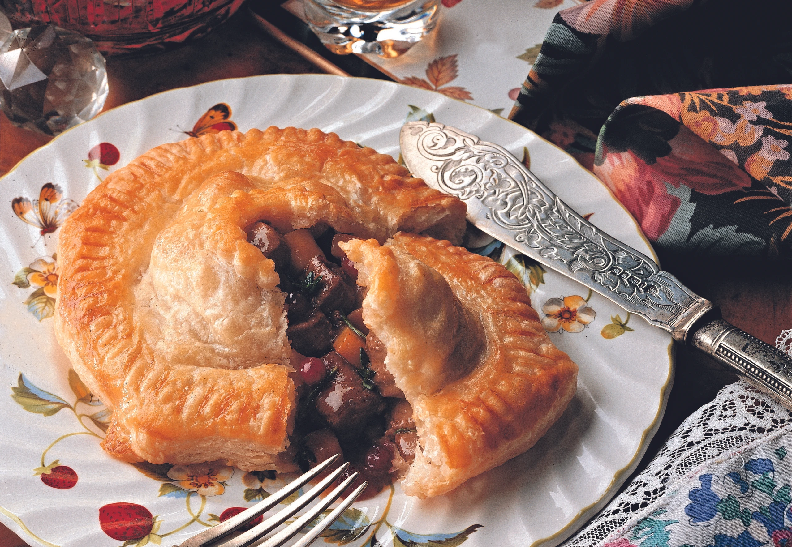 In der Mitte jedes Pies ein ca. 1 cm großes Loch ausstechen, durch das während des Backens der Dampf entweichen kann. Pies im vorgeheizten Rohr (mittlere Schiene) ca. 1⁄2 Stunde backen. Gegen Ende der Garzeit durch das Loch im Deckel Bratensaft träufeln.