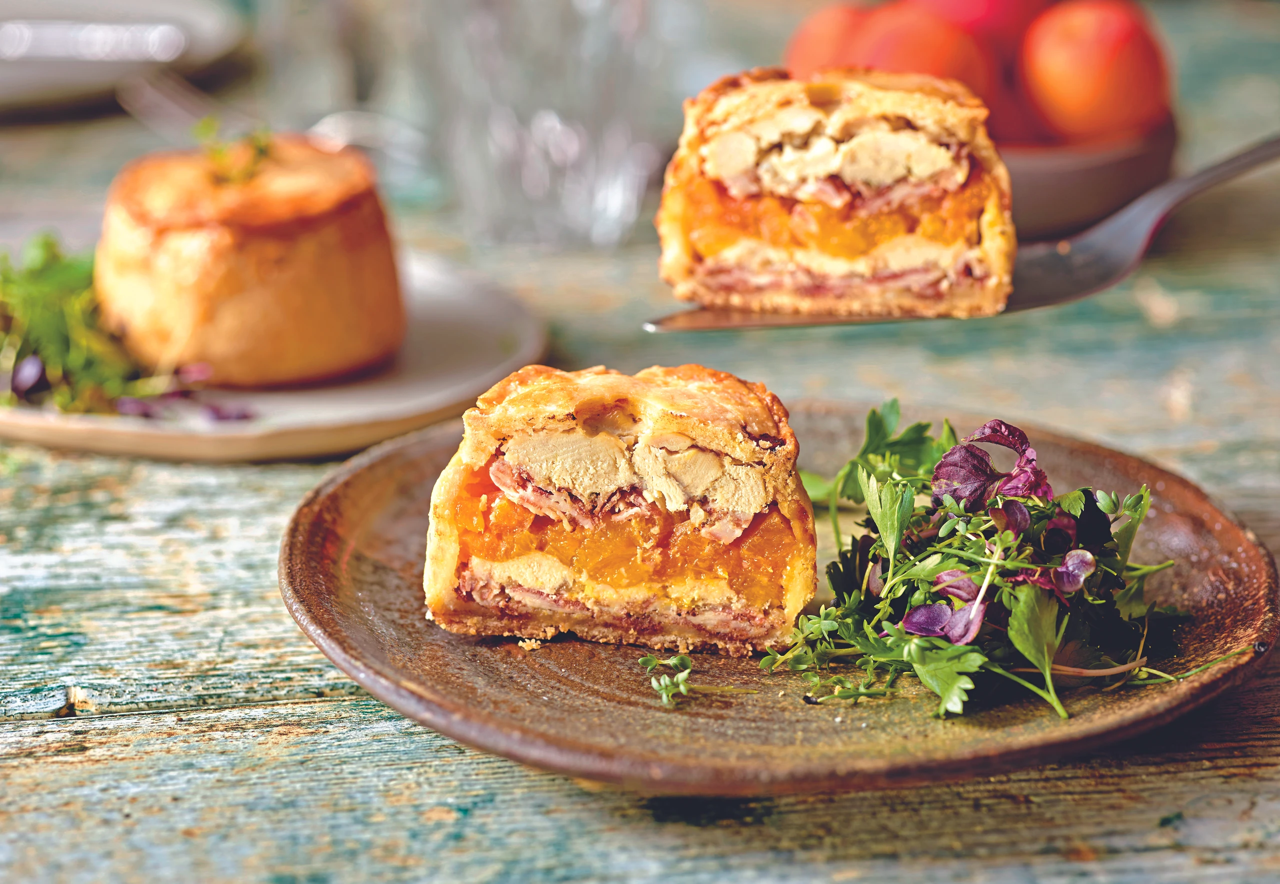 Rohr auf 200°C vorheizen. Gläser mit heißem Wasser füllen, um sie besser vom Teig lösen zu können. Gläser aus der Teighülle ziehen. Pies schichtweise mit Speck, Zwiebeln, Huhn und Marille füllen. Fülle vorsichtig andrücken. Ränder mit Ei bestreichen. Teigdeckel auf die Pies legen, leicht andrücken und überstehende Ränder wegschneiden. Im Rohr (mittlere Schiene) ca. 1 Stunde goldbraun backen. Herausnehmen und beiseite stellen.