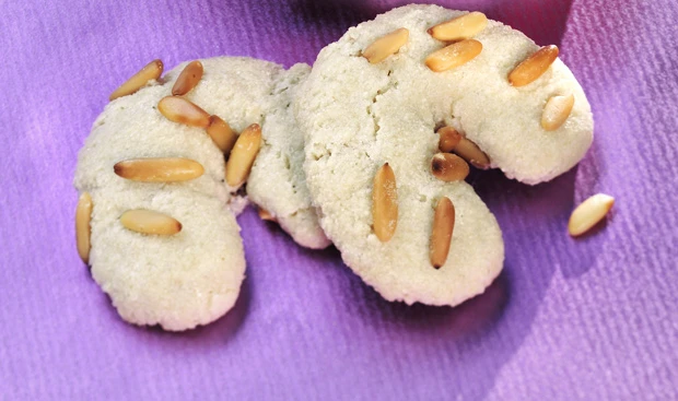 Aus dem Teig mit einem Löffel kleine Stücke (ca. 12 g) abstechen, mit befeuchteten Händen Kipferln formen. Kipfern in die Pignoli drücken und auf das Blech legen; etwas Abstand halten, sie gehen beim Backen stark auf.