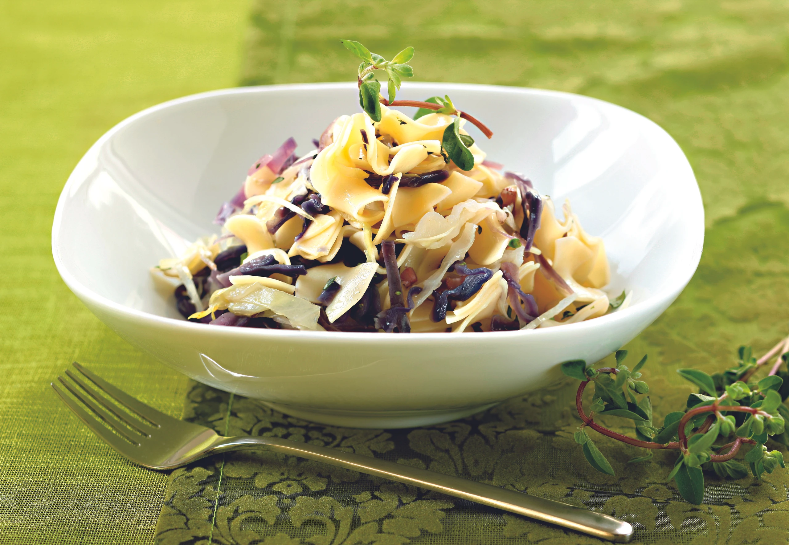 Pikante Krautfleckerl mit zweierlei Kraut und Speck