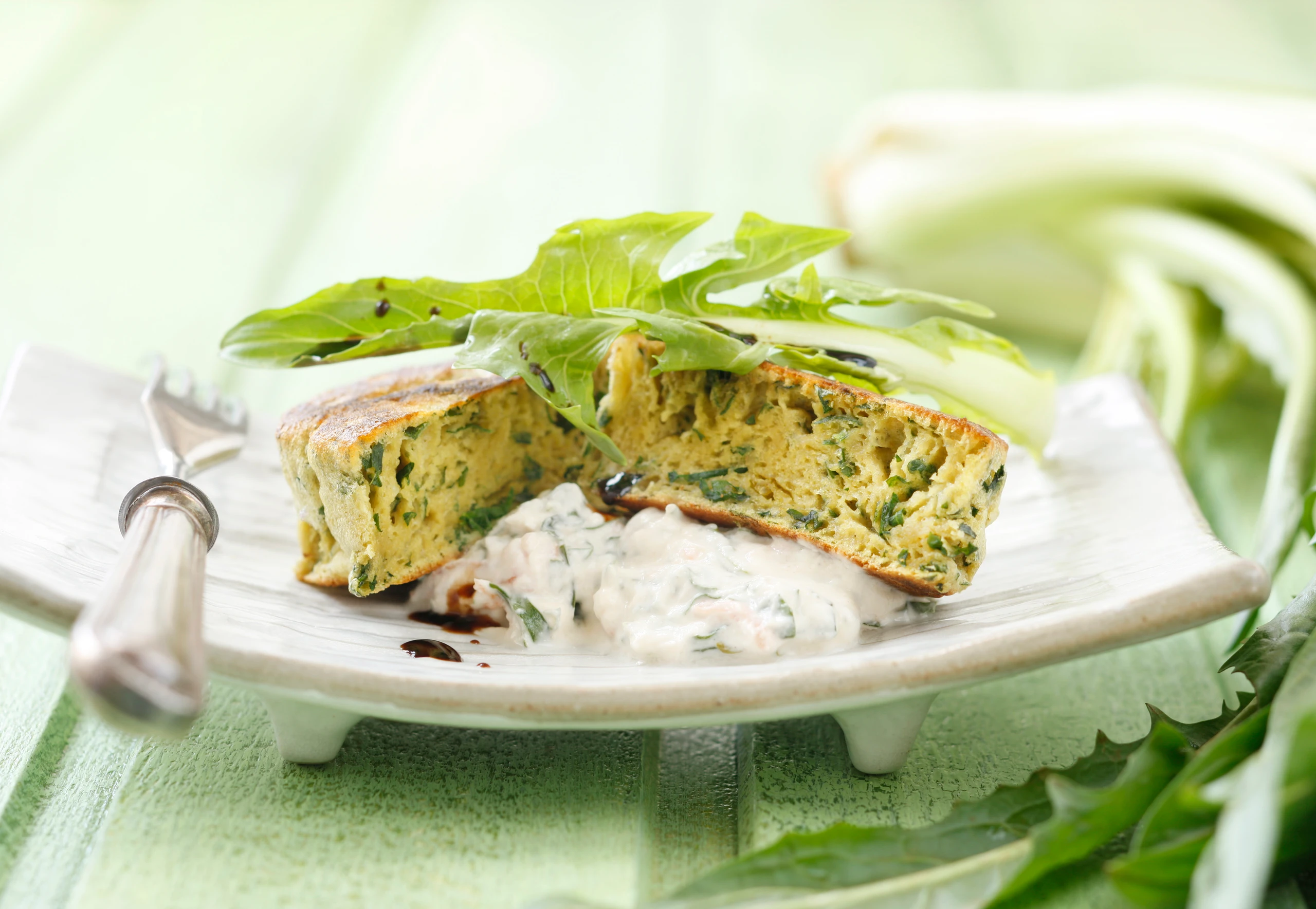 Für den Salat Balsamico salzen, pfeffern und mit dem Kernöl verrühren. Löwenzahn unter-mischen. Dalken mit dem Topfen anrichten und mit dem Salat garniert servieren.
