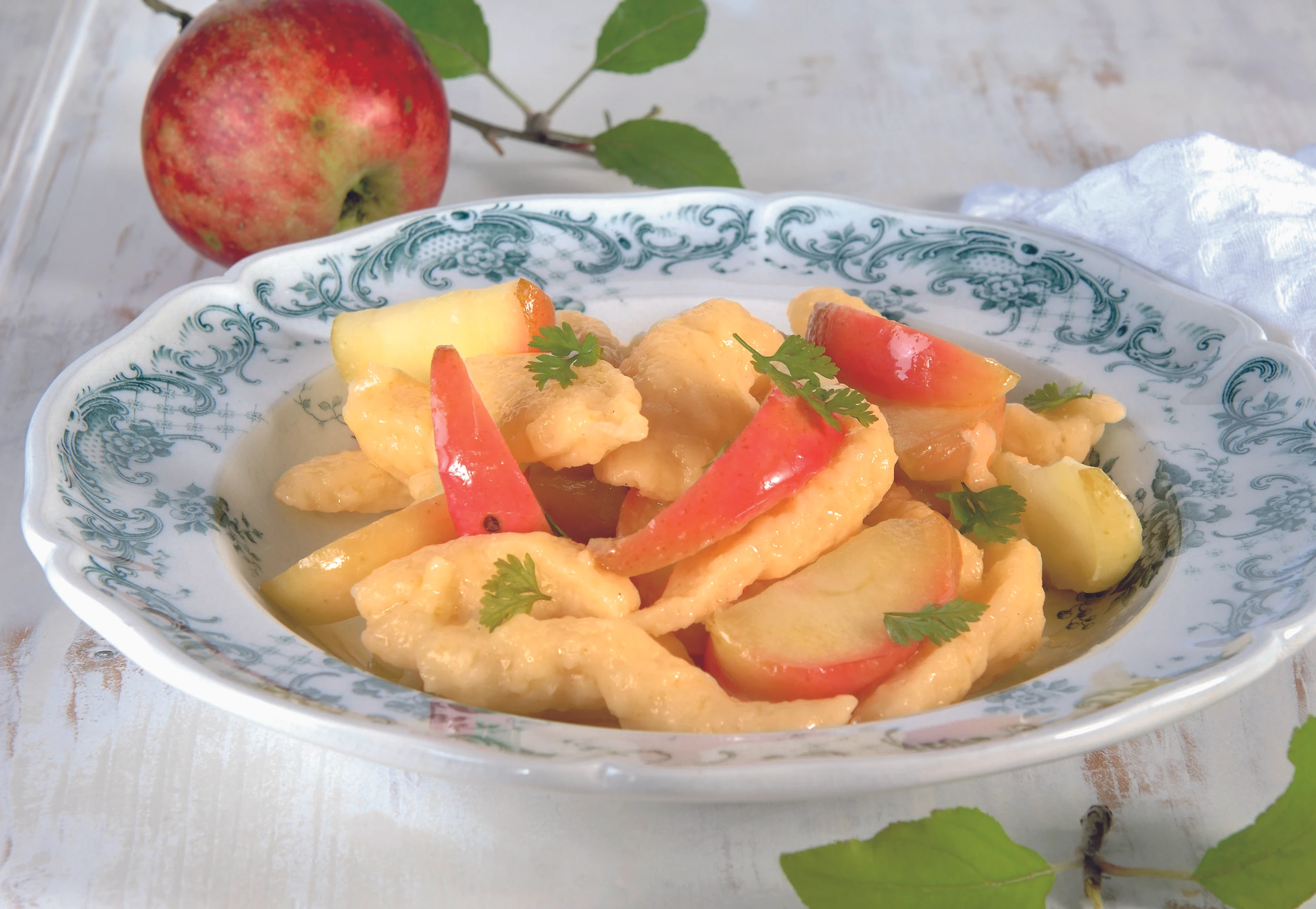 Nockerl mit einem Siebschöpfer herausheben und gut abtropfen lassen. Nockerl mit den Apfelspalten vermischen und ca. 3 Minuten ziehen lassen. Apfelnockerl anrichten und mit Petersilie bestreut servieren.