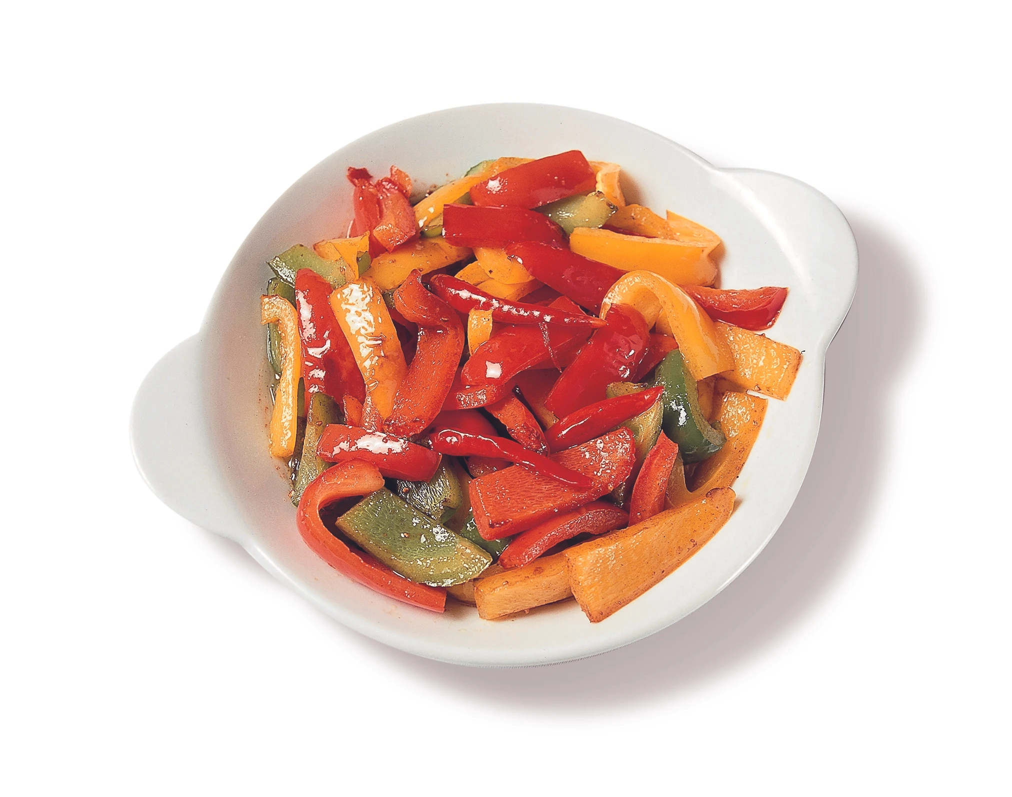 Paprika der Länge nach halbieren, Stiele und Kerne entfernen. Paprika in Streifen schneiden und gemeinsam mit dem Thymian in Olivenöl knackig anschwitzen.