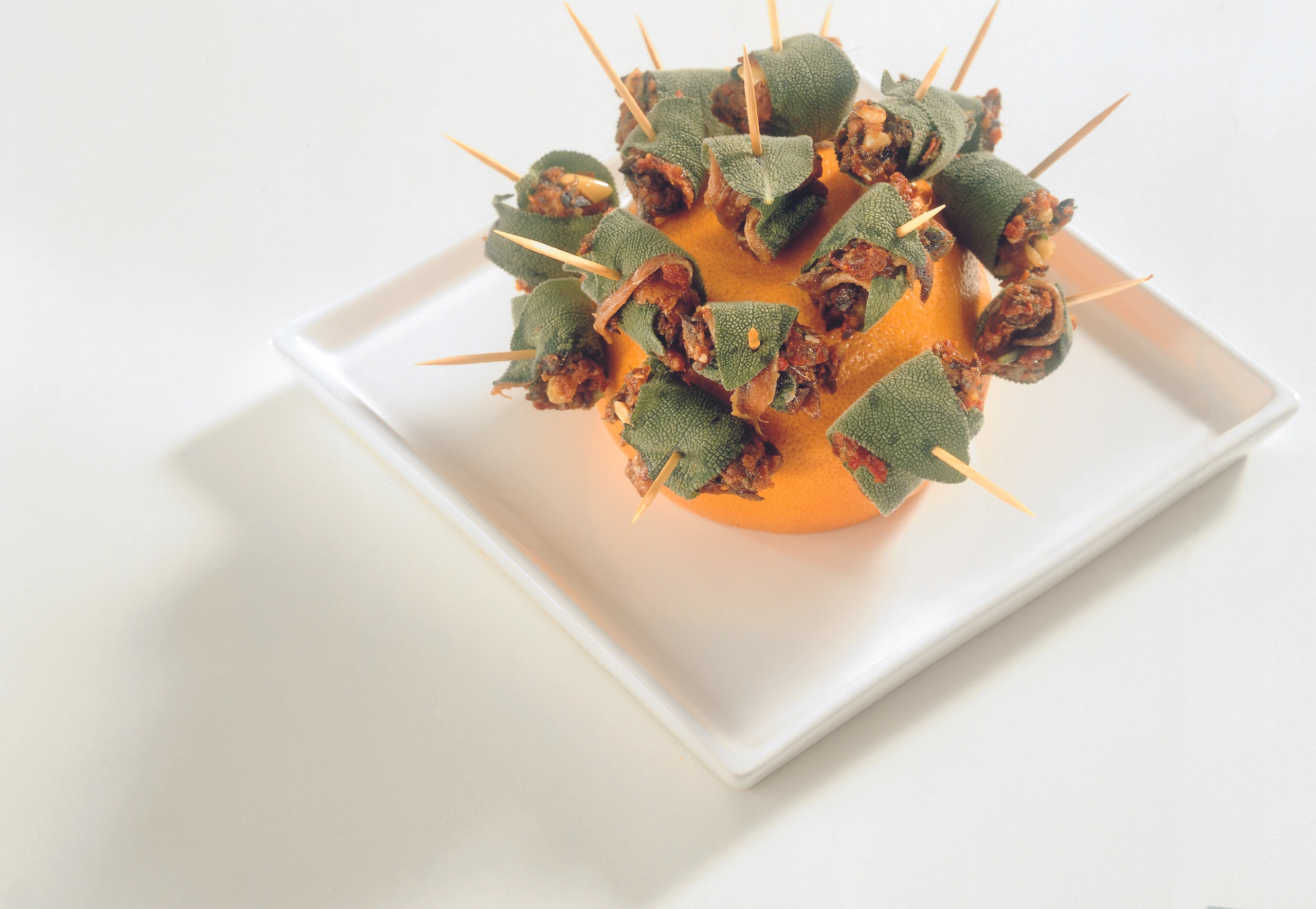 Sardellenfilets auf Küchenpapier abtropfen lassen. Je ein Salbeiblatt mit einem Sardellenfilet belegen, dünn mit Fülle bestreichen und einrollen. Die Röllchen mit einem Zahnstocher auf ein Stück Weißbrot oder wie auf unserem Foto auf eine Orange stecken.