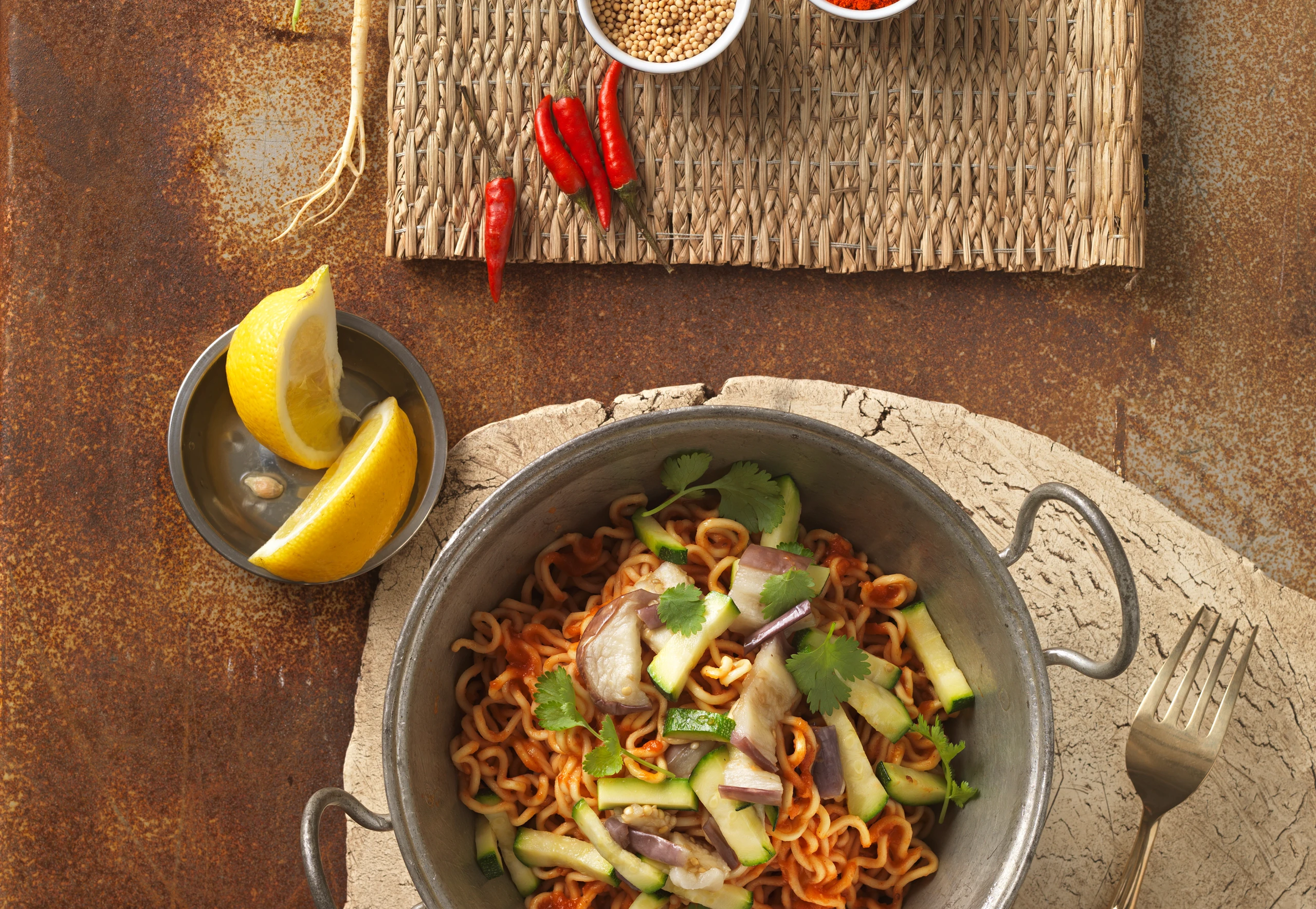 Paradeissauce erhitzen. Nudeln untermischen und unter Rühren einige Minuten erhitzen. Nudeln mit Salz und Chili abschmecken, anrichten, Melanzani und Zucchini darauf geben, mit Koriander bestreuen.