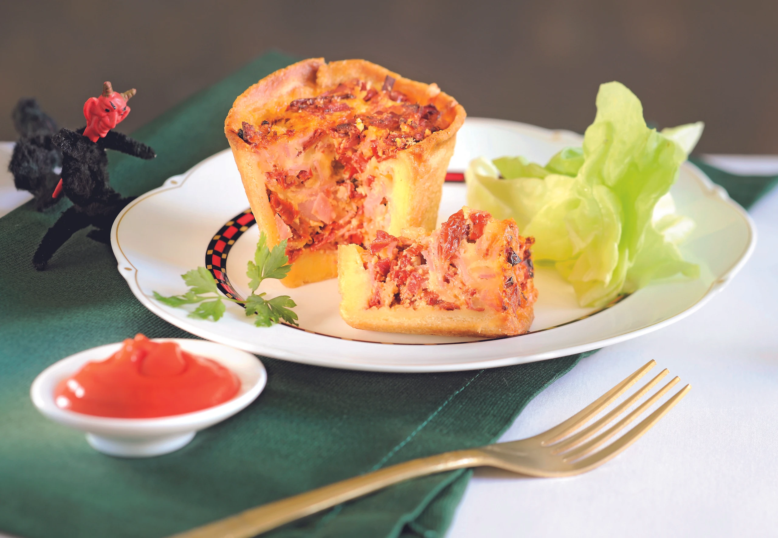 Muffins kurz überkühlen lassen und mit einem Messer aus der Form lösen. Mit Ketchup und Blattsalat servieren.