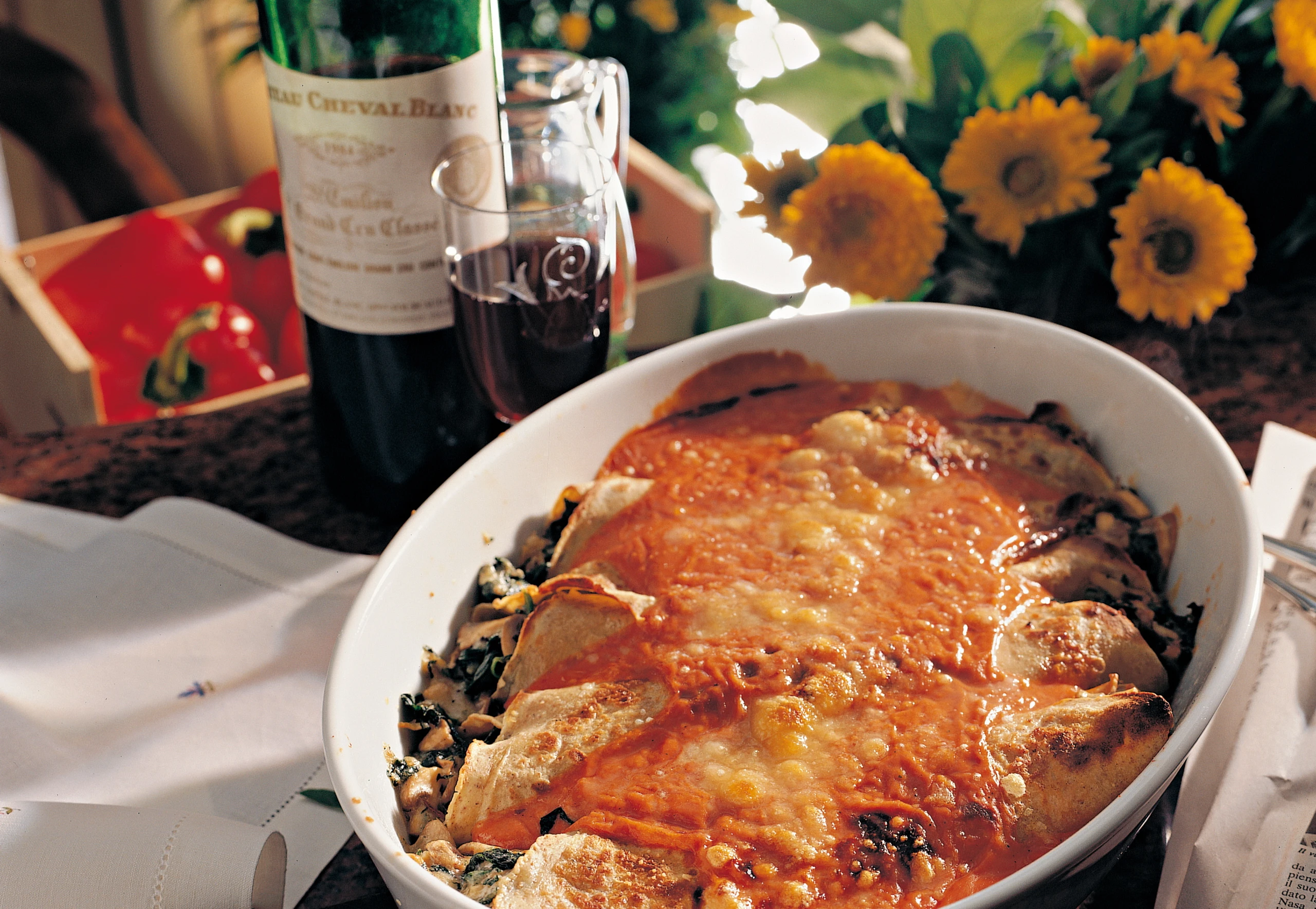 Aus dem Teig acht Palatschinken backen, mit Fülle bestreichen und einrollen. Palatschinken in die vorbereitete Form schichten, mit Sauce übergießen, mit restlichem Käse bestreuen und im vorgeheizten Rohr (mittlere Schiene/Gitterrost) 20–30 Minuten überbacken. Vor dem Servieren eventuell mit Jungzwiebel-Ringen bestreuen.