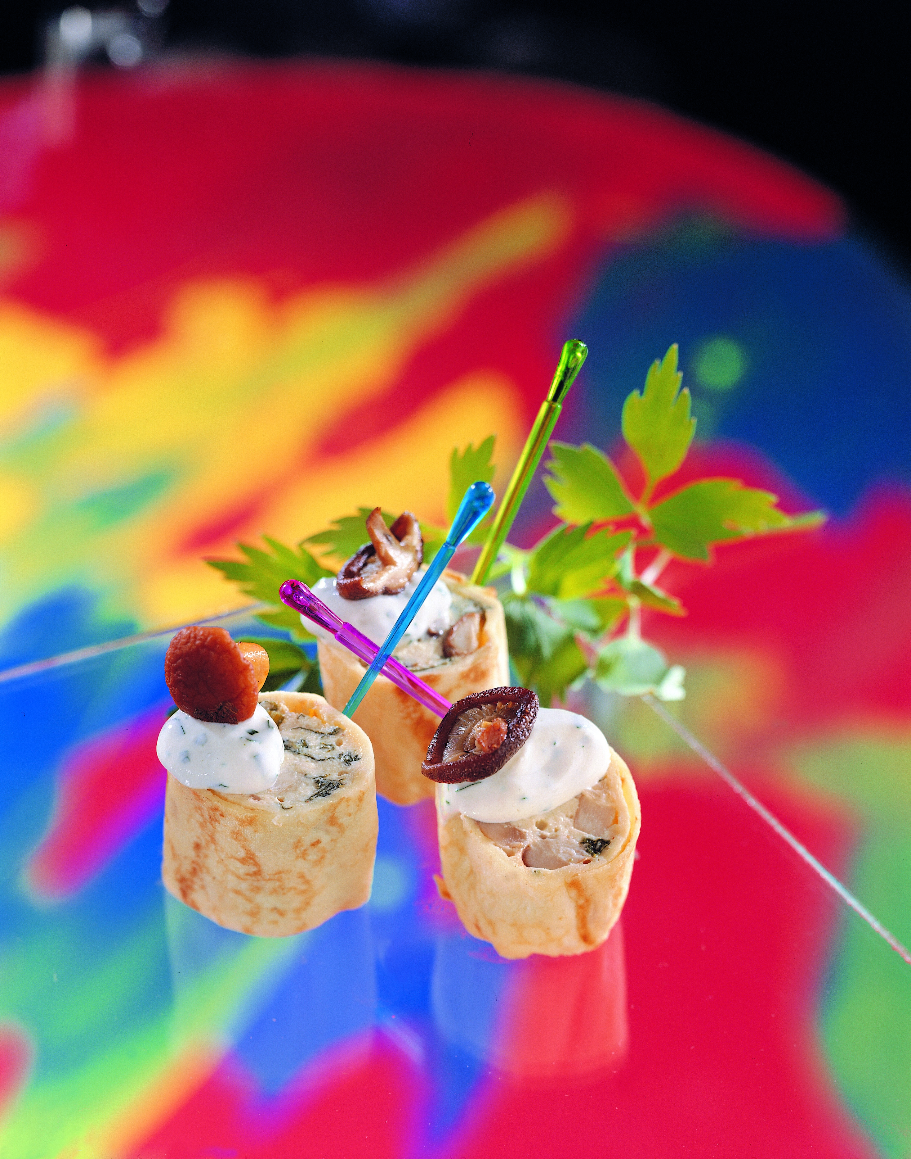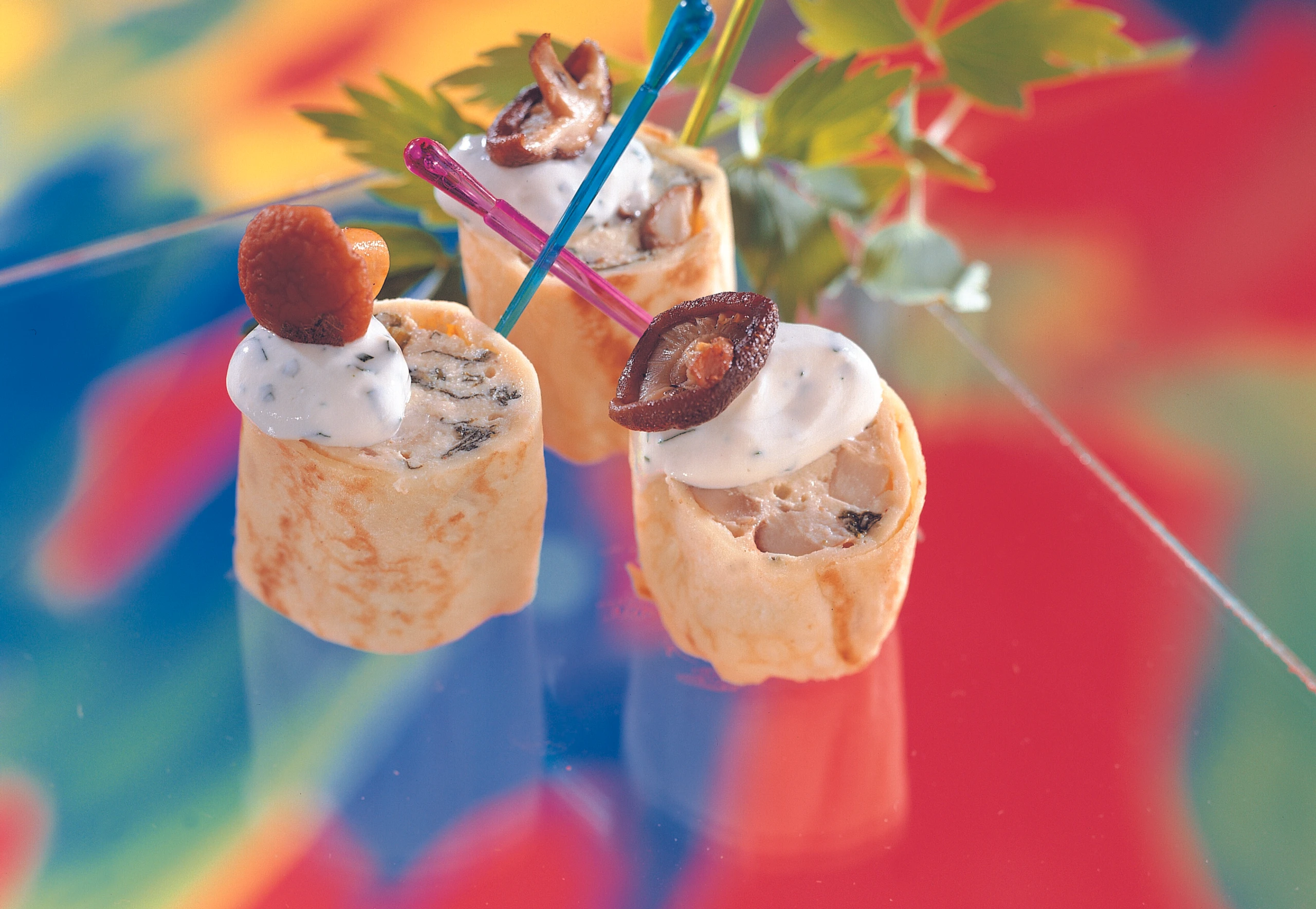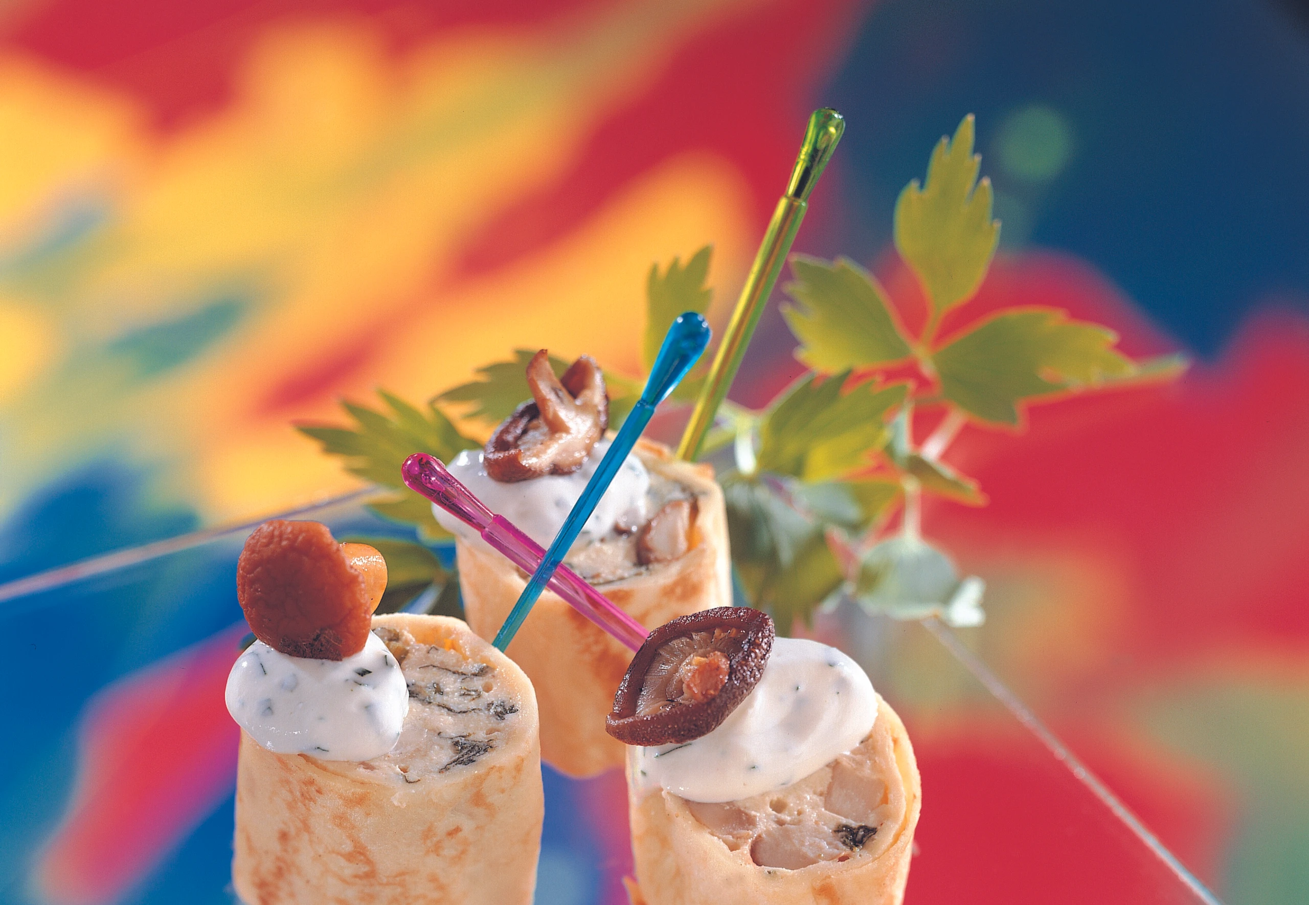 Palatschinken mit Fülle bestreichen, einrollen und in Klarsichtfolie, dann in Alufolie wickeln, Folie mehrmals umbiegen. Rollen in leicht kochendem Wasser 15 Minuten ziehen lassen. Auspacken und in Scheiben schneiden. Mit Kräuterrahm servieren.
