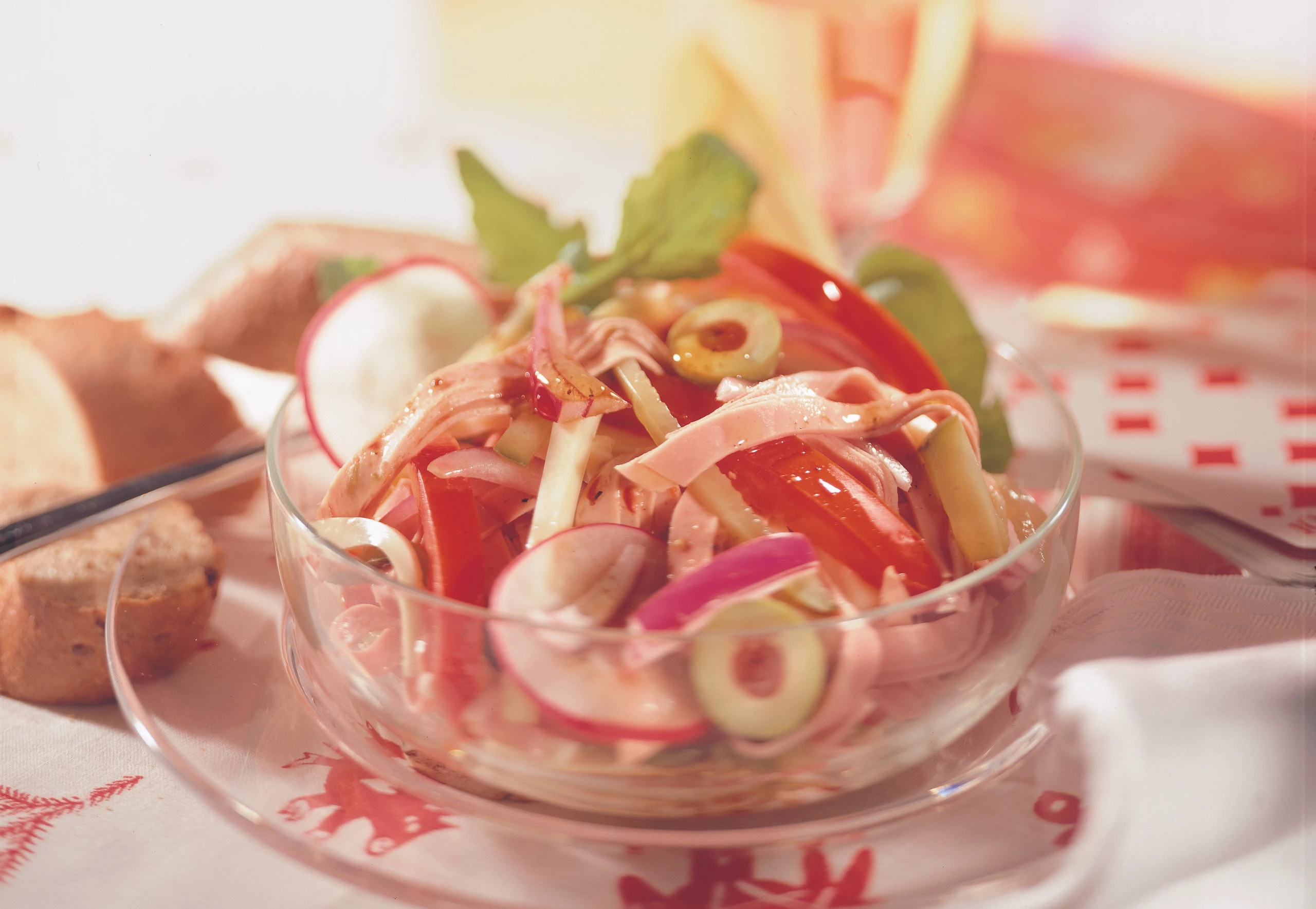 Radieschen putzen, waschen und in Scheiben schneiden. Paradeiser vierteln und entkernen. Paprika putzen und waschen. Zwiebel schälen. Beide Wurstsorten sowie Käse, Essiggurken, Paradeiserstücke, Zwiebel und Paprika in Streifen schneiden. Oliven halbieren.