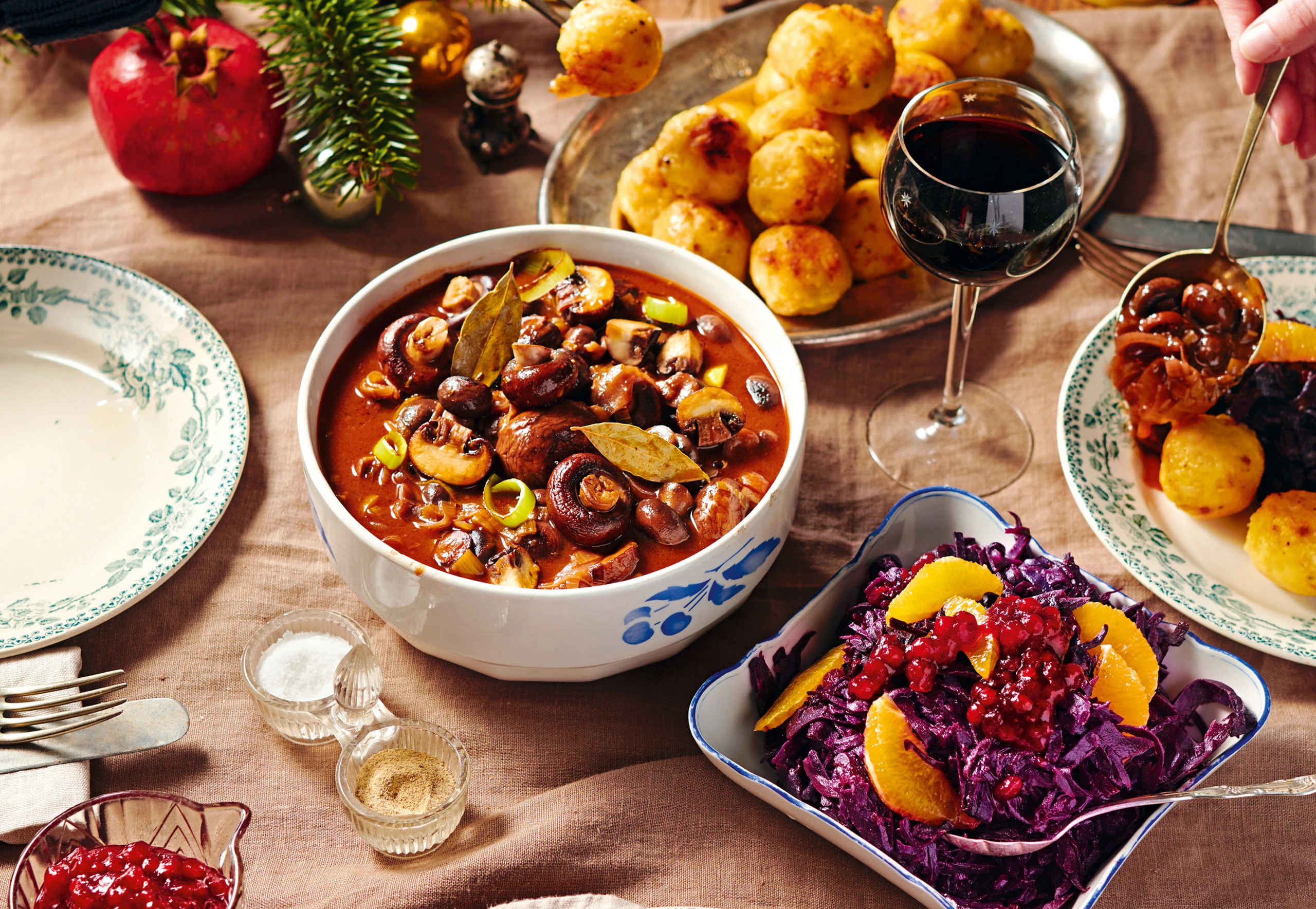 Pilz-Bourguignon mit Erdäpfelknöderl und Orangen-Rotkraut
