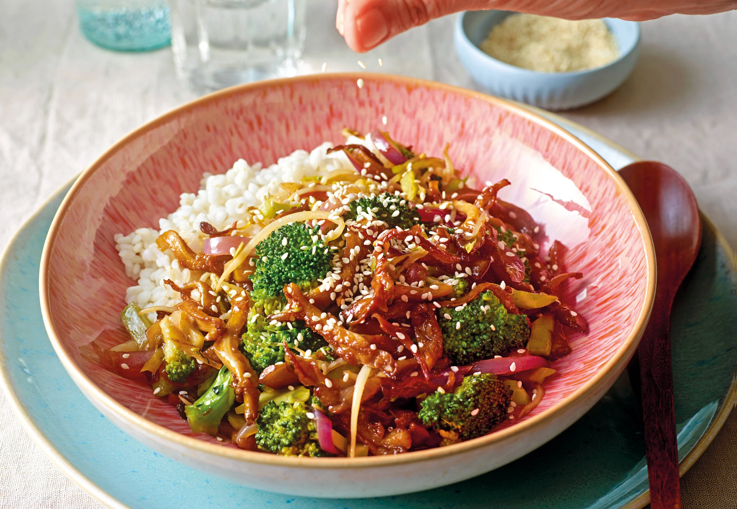 Mit Reis anrichten und mit Sesam bestreuen.