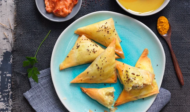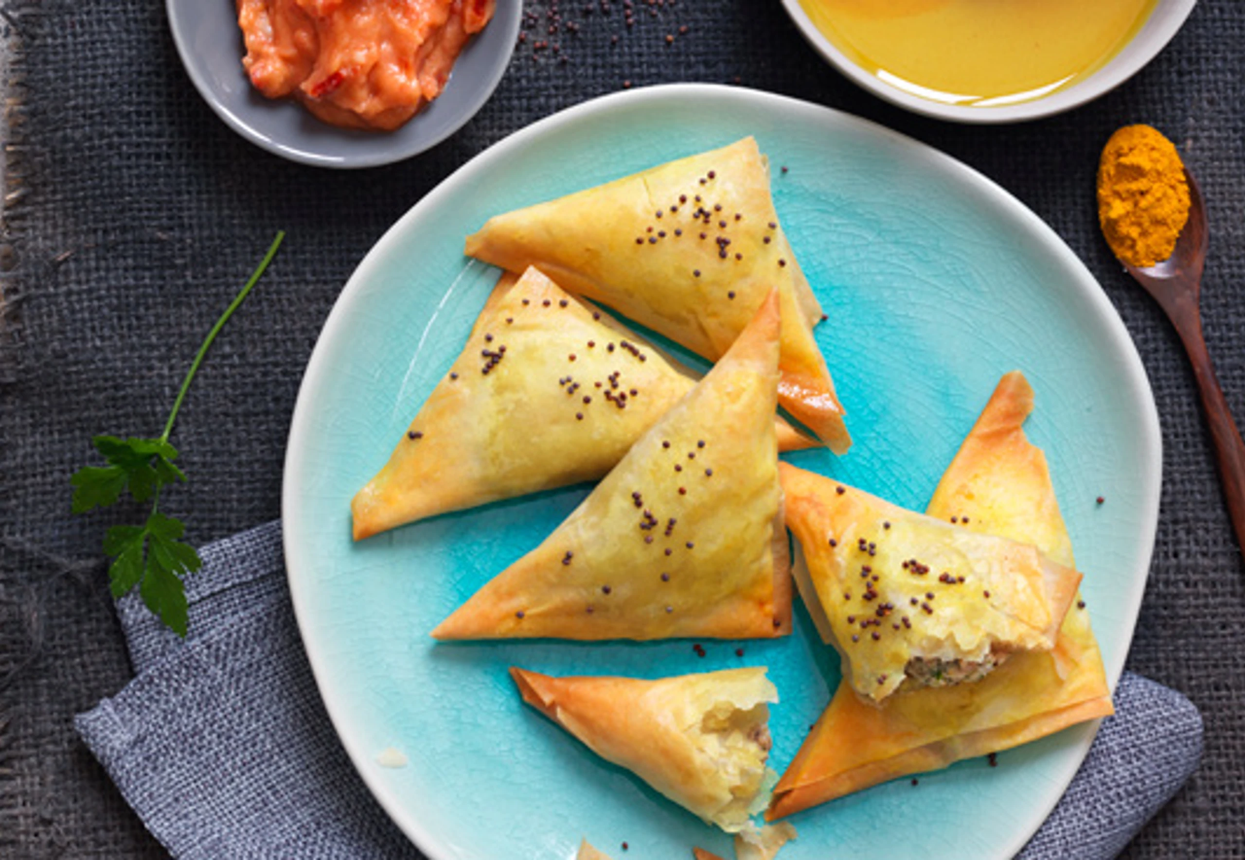 Rohr auf 200°C vorheizen. Backblech mit Öl bestreichen. Strudelblatt auflegen, mit Öl bestreichen und in Streifen (10 x 35 cm) schneiden. Stellen Sie sich nun am unteren Ende jedes Streifens ein Quadrat mit 10 cm Seitenlänge vor. In die linke obere Ecke des Quadrats 2 TL Füllung setzen, die rechte untere Ecke über die Füllung klappen, so dass ein Dreieck entsteht. Fortfahren, bis der Streifen aufgebraucht ist. Teigende anfeuchten und an das Tascherl drücken. Tascherln auf das Blech legen.