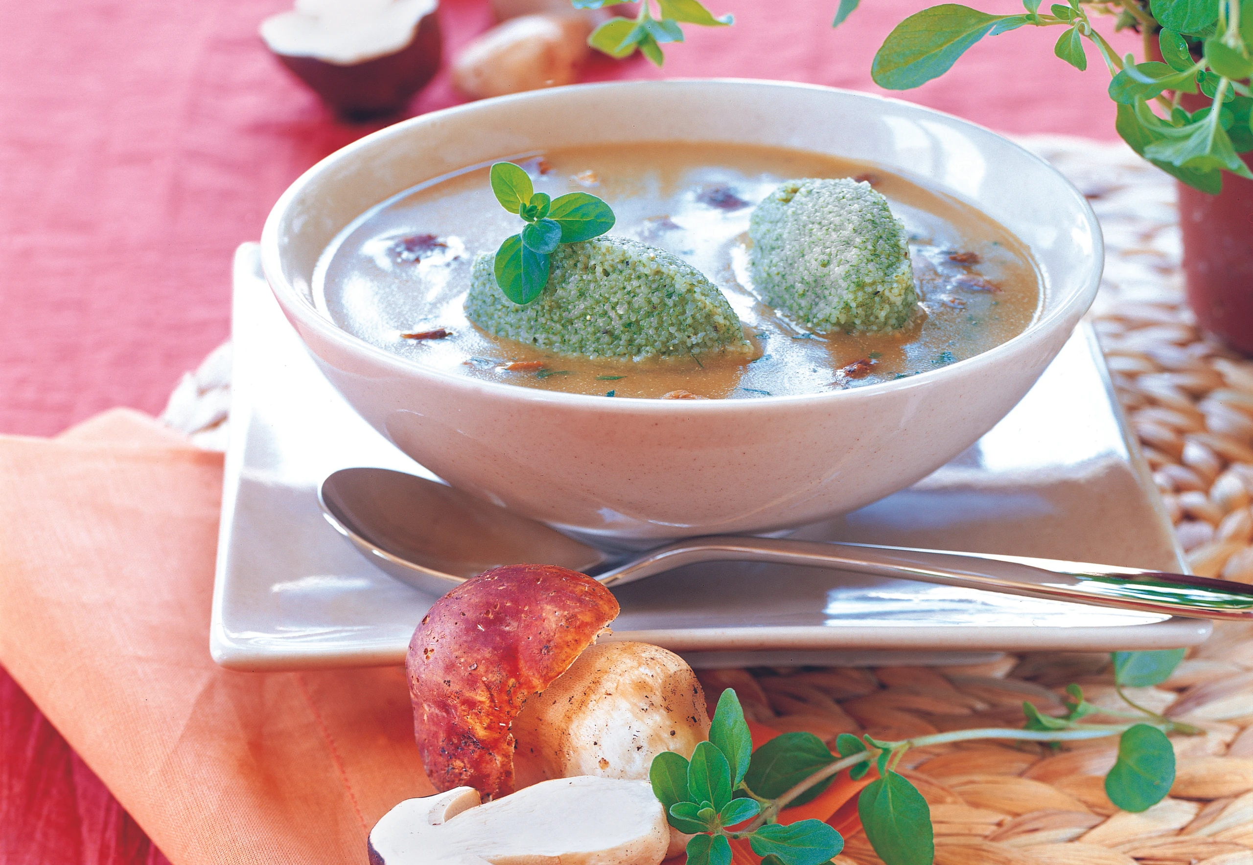 Herausheben und abtropfen lassen. Suppe mit Steinpilzen und Nockerln anrichten, mit Majoran bestreuen.
