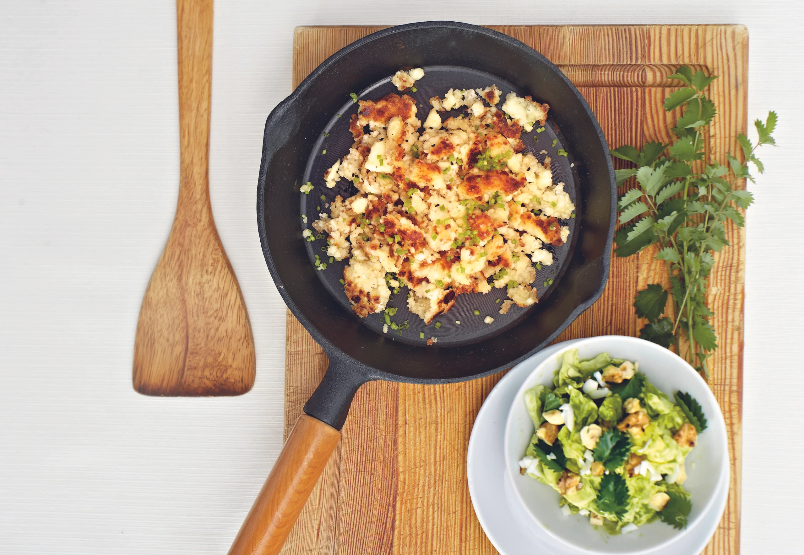 - In einer großen Pfanne Butterschmalz erhitzen. Masse in der Pfanne verteilen. Im Rohr (mittlere Schiene / Gitterrost) ca. 15 Minuten backen, dabei ab und zu auflockern. Schmarren mit Schnittlauch bestreuen und mit dem Salat servieren.