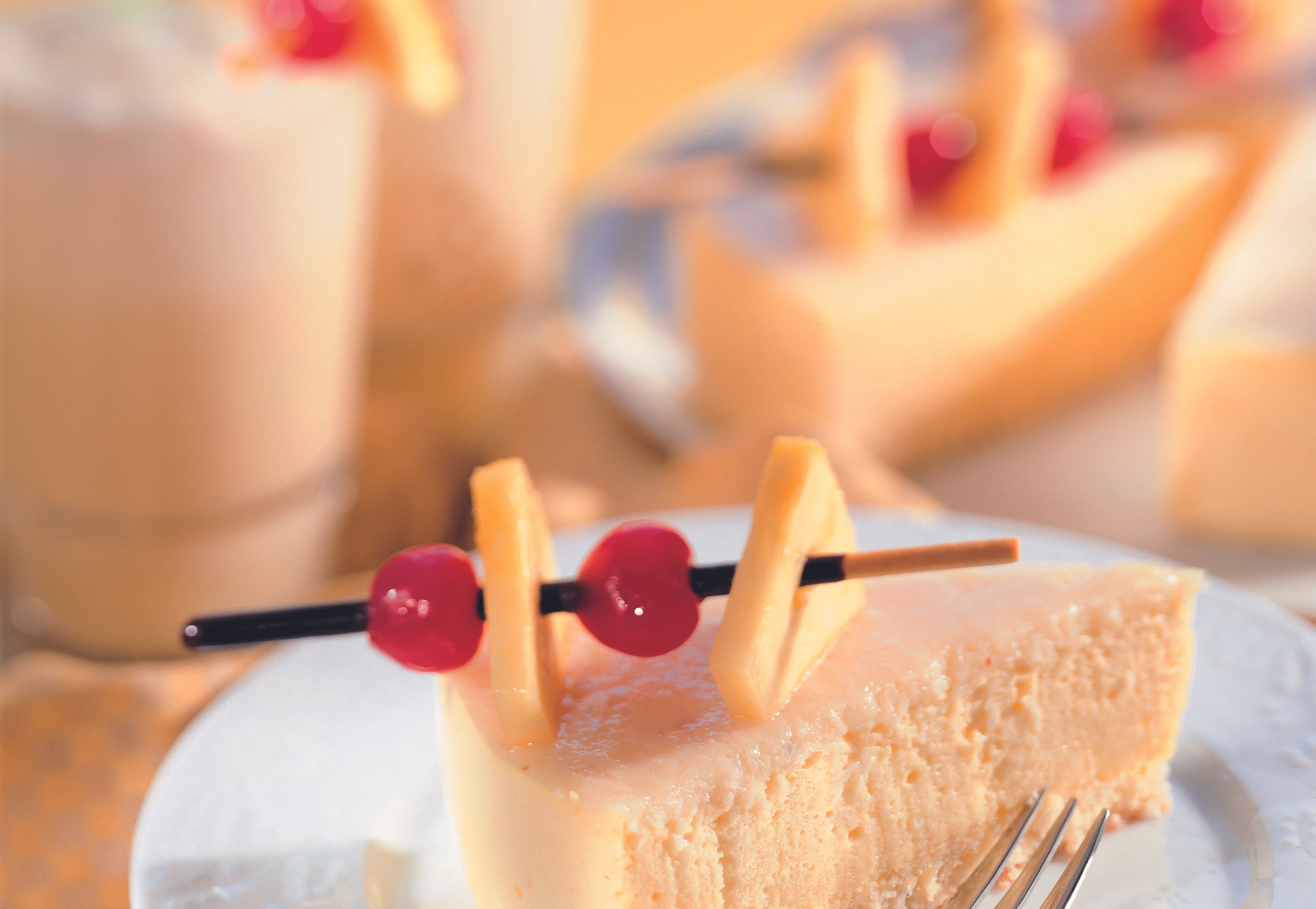 Reservierte Ananas in 10 Stücke schneiden. Je 2 Cocktailkirschen und Ananasstücke abwechselnd auf die Keksstangerl spießen. Torte aus der Form lösen, mit den Spießchen garnieren.