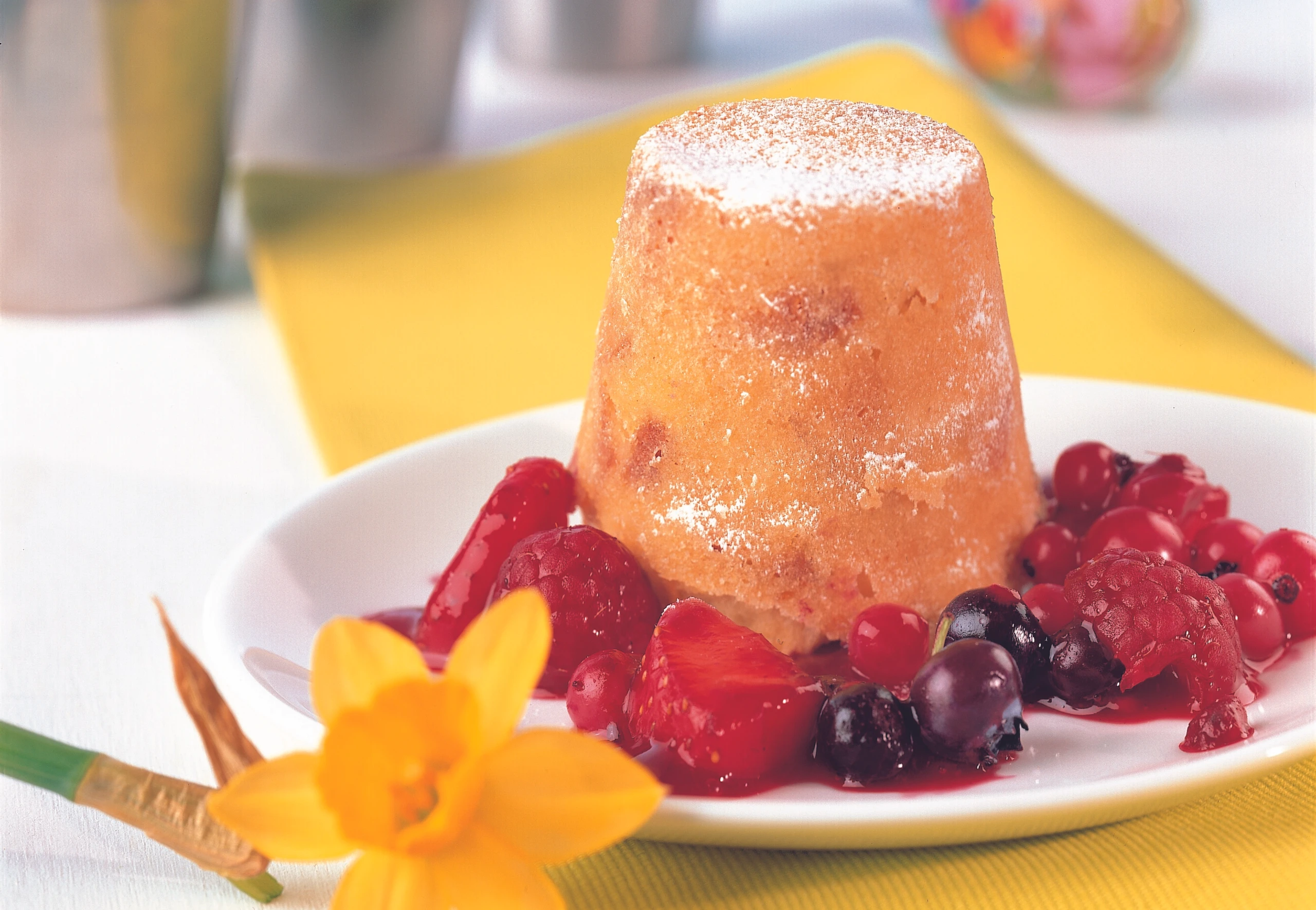 Aufläufe aus dem Rohr nehmen, aus den Förmchen stürzen und mit dem Beerenröster servieren.