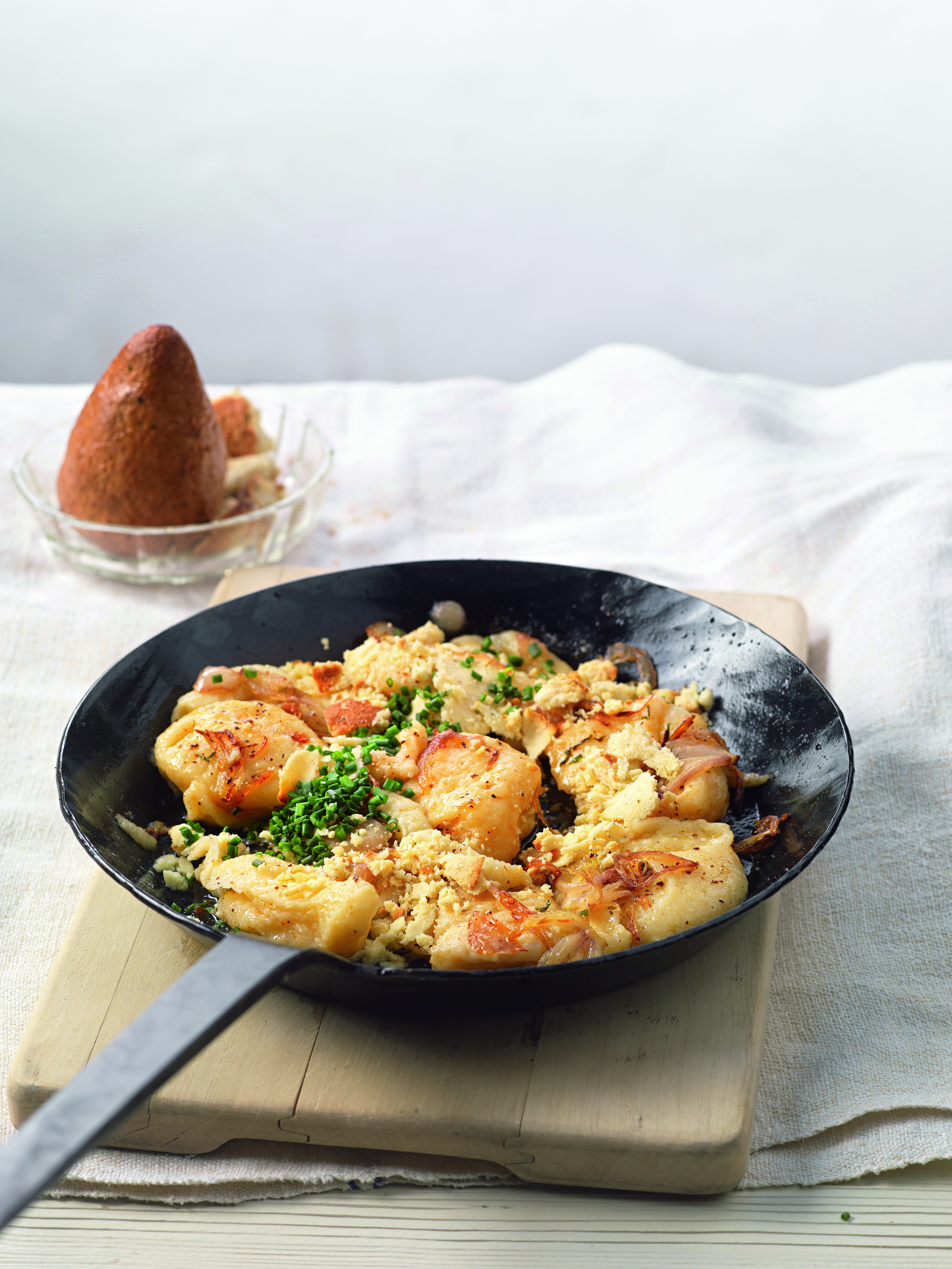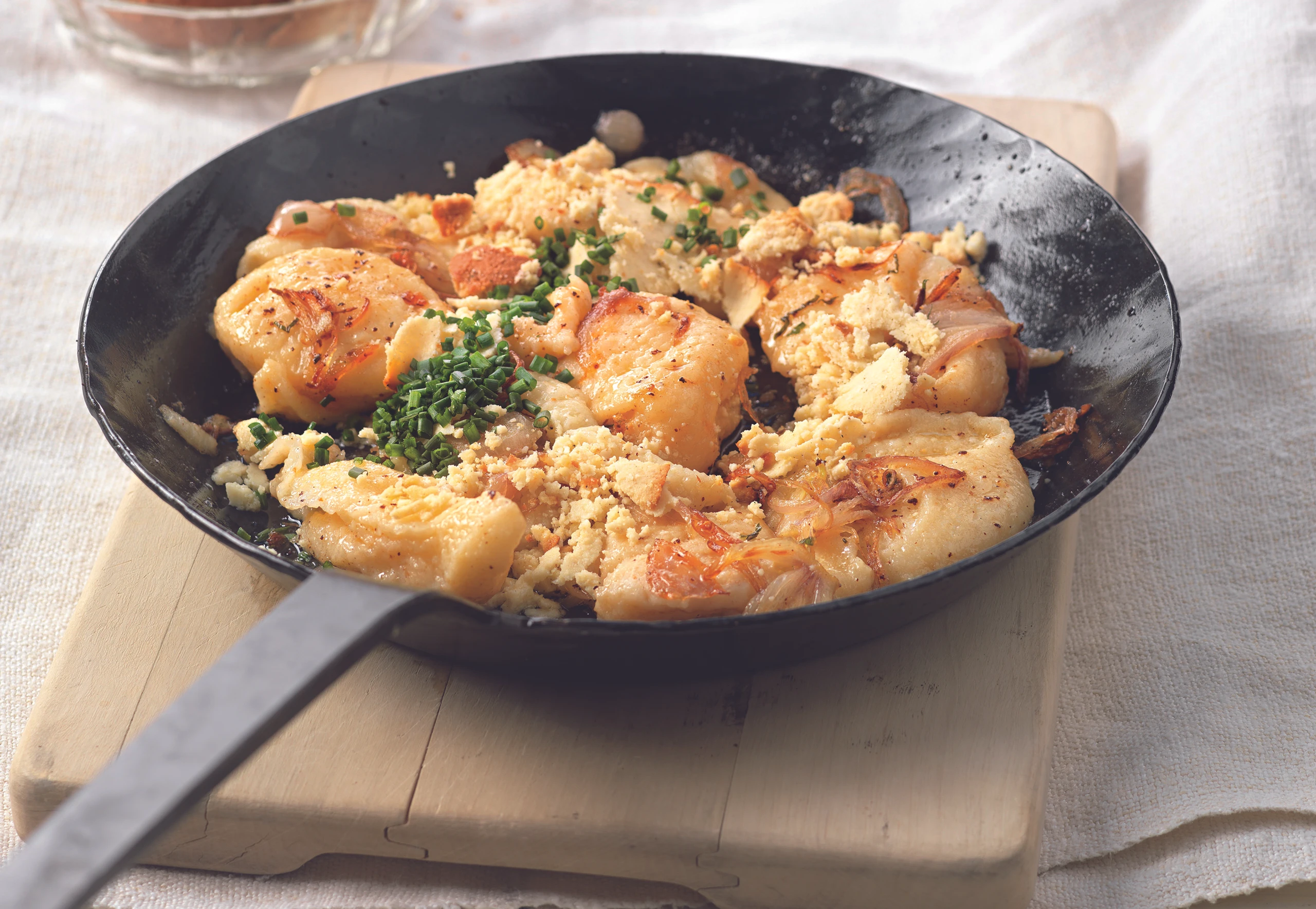 Für die Garnitur Schotten reiben. Zwiebel schälen und in feine Streifen schneiden. Butter erhitzen, Zwiebel darin hellbraun rösten. Käse zugeben, kurz mitrösten. Nockerln untermischen. Schnittlauch fein schneiden. Schottnocken mit Schnittlauch bestreut anrichten.
