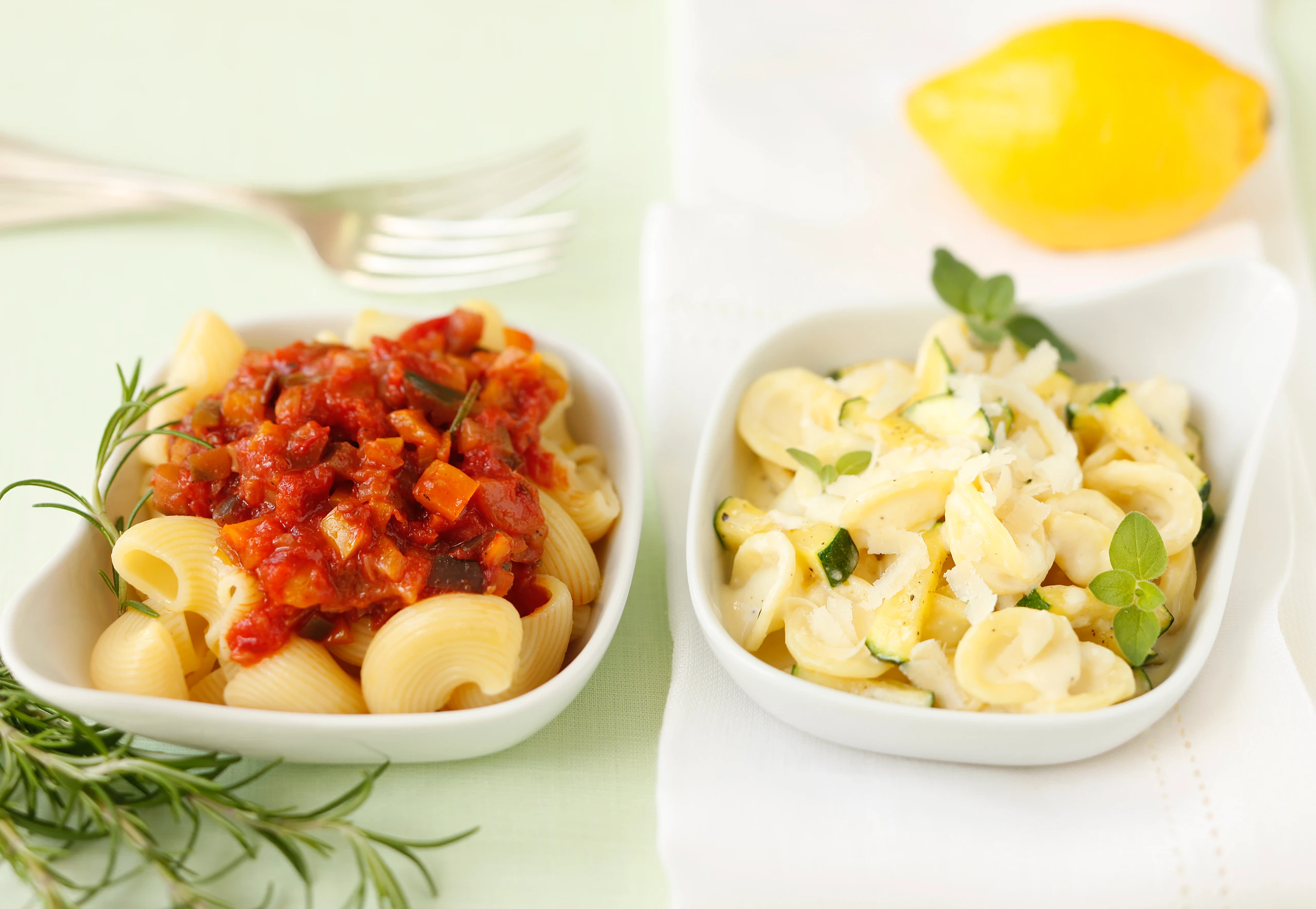 Pasta in reichlich Salzwasser bissfest kochen, abseihen, abtropfen lassen und mit dem restlichen Öl vermischen. Pasta mit dem Ratatouille anrichten und eventuell mit Rosmarin garniert servieren.