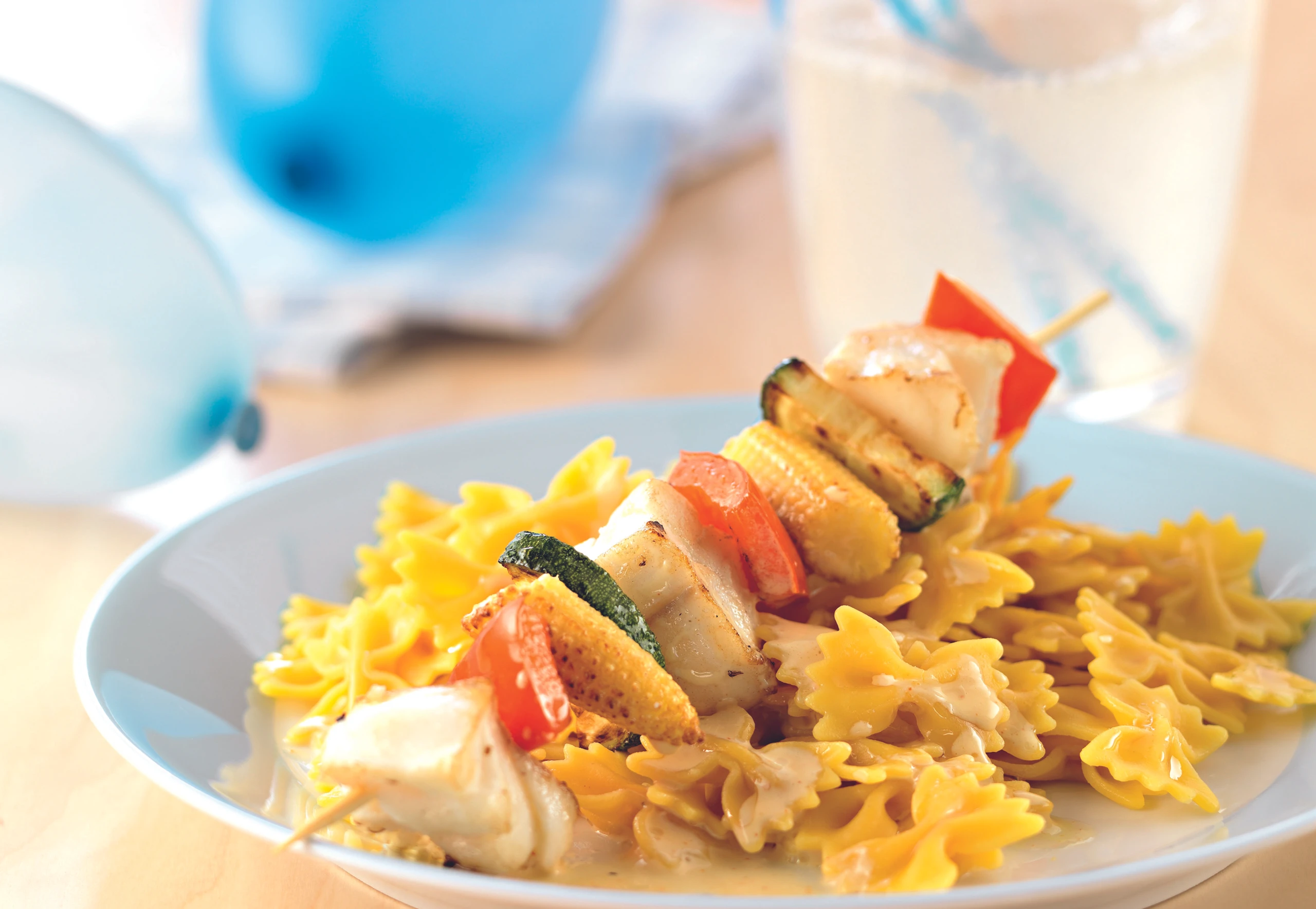 Pasta in reichlich Salzwasser bissfest kochen, abseihen, abschrecken und gut abtropfen lassen. Fisch und Gemüse abwechselnd auf 2 Holzspieße stecken, mit Salz, Pfeffer und Zitronensaft würzen.