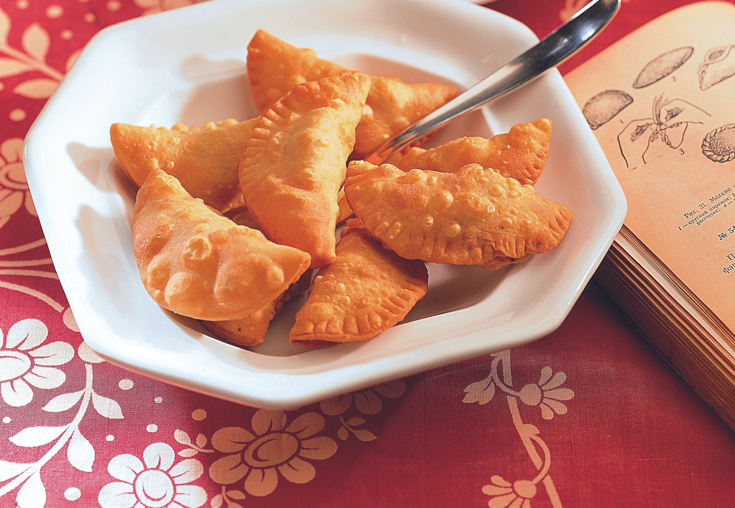Fülle in kleinen Häufchen auf die Teigscheiben setzen. Teigränder mit Eiklar bestreichen, Scheiben zusammenklappen. Ränder fest drücken und mit einer Gabel behutsam zusammendrücken.