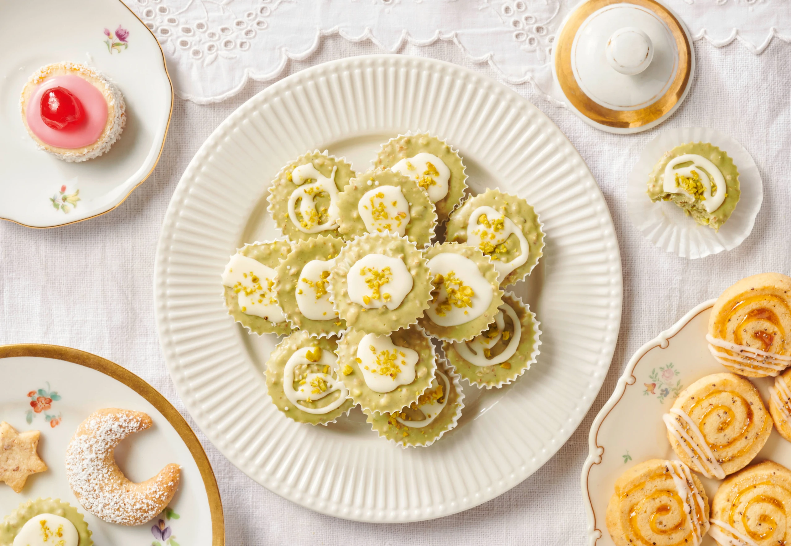 Gusto-Tipp: Wenn Sie keine Mini-Förmchen haben, können Sie mit einem Teelöffel kleine Häufchen der Masse auf Backpapier setzen und auskühlen lassen. Statt der Pistaziencreme kann auch Karamell- oder Schoko-Nusscreme verwendet werden.