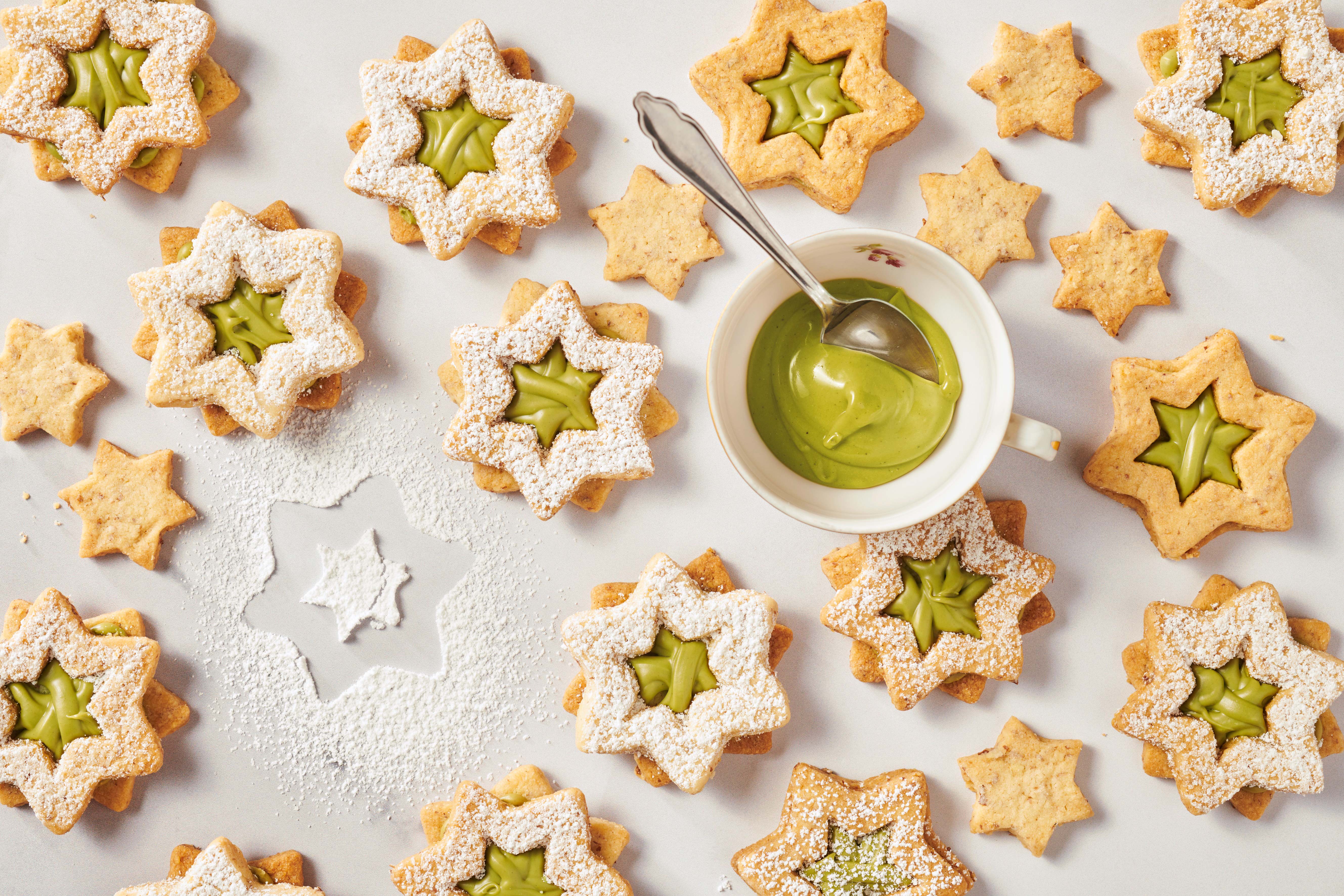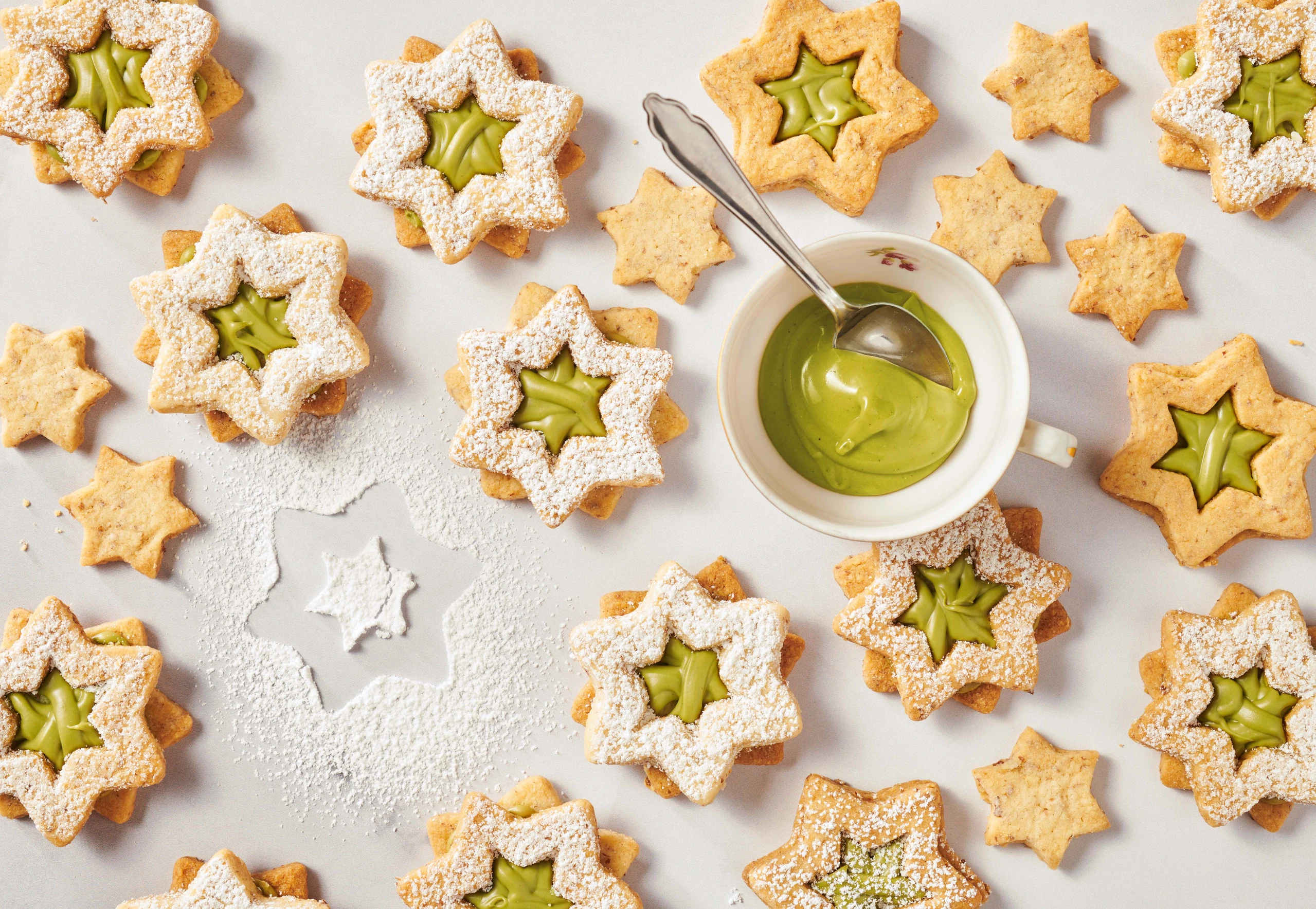 Volle Sterne mit der Pistaziencreme bestreichen, Kekse mit dem Stern-Loch darauflegen und leicht andrücken. Pistazien-Sterne mit Staubzucker bestreuen und in einer Blechdose trocken lagern.