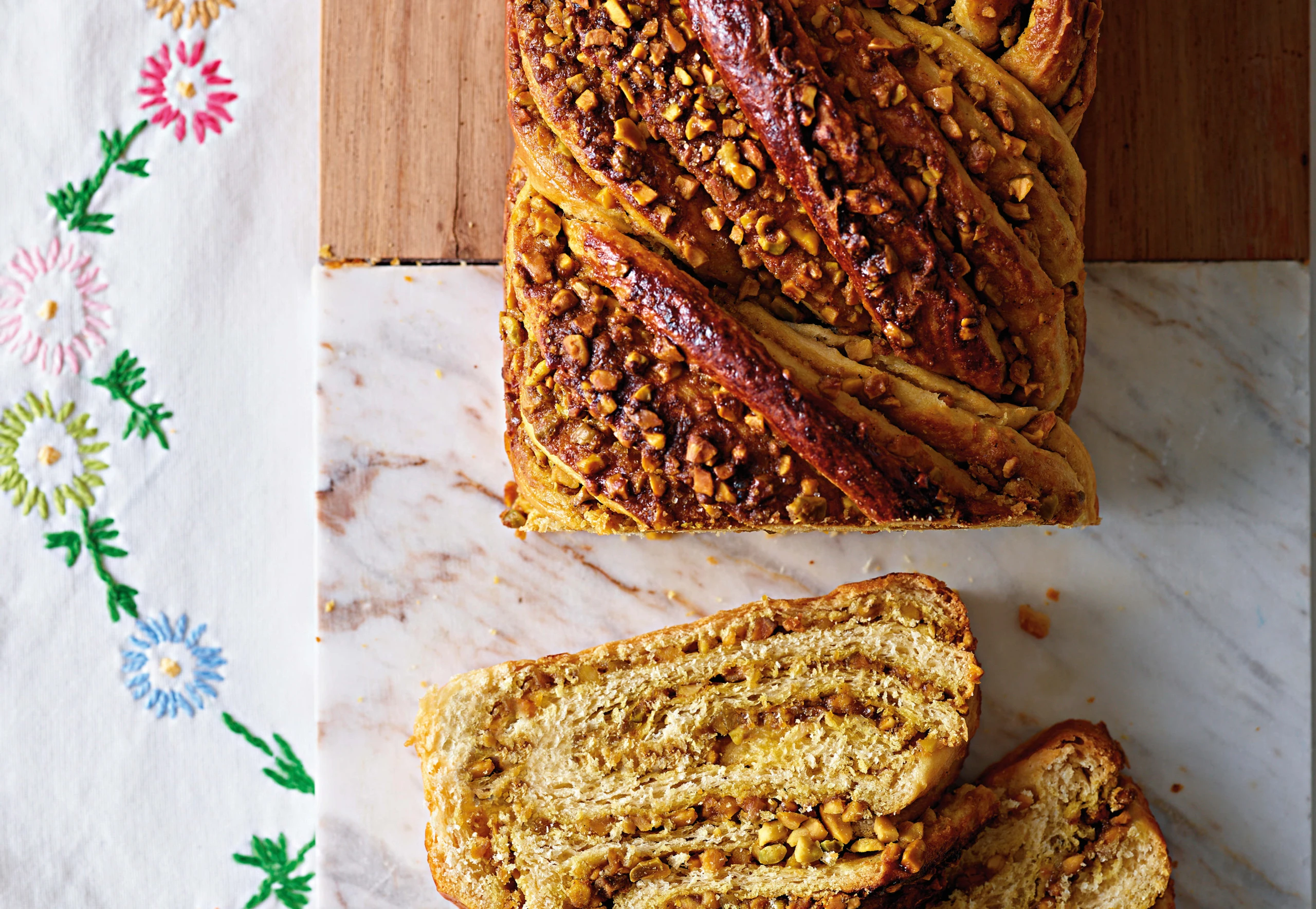 Teig rechteckig (ca. 40 x 30 cm) ausrollen, mit Pistaziencreme bestreichen und mit Pistazien bestreuen. Die Längsseiten ca. 1 cm einschlagen, Teig von der Breitseite aus straff einrollen. Naht mit befeuchteten Fingerspitzen zusammendrücken. Rolle mit einem scharfen Messer der Länge nach halbieren. Stränge mit der Schnittfläche nach oben nebeneinander auflegen, am oberen Ende zusammendrücken und ineinander verdrehen. Enden zusammendrücken.