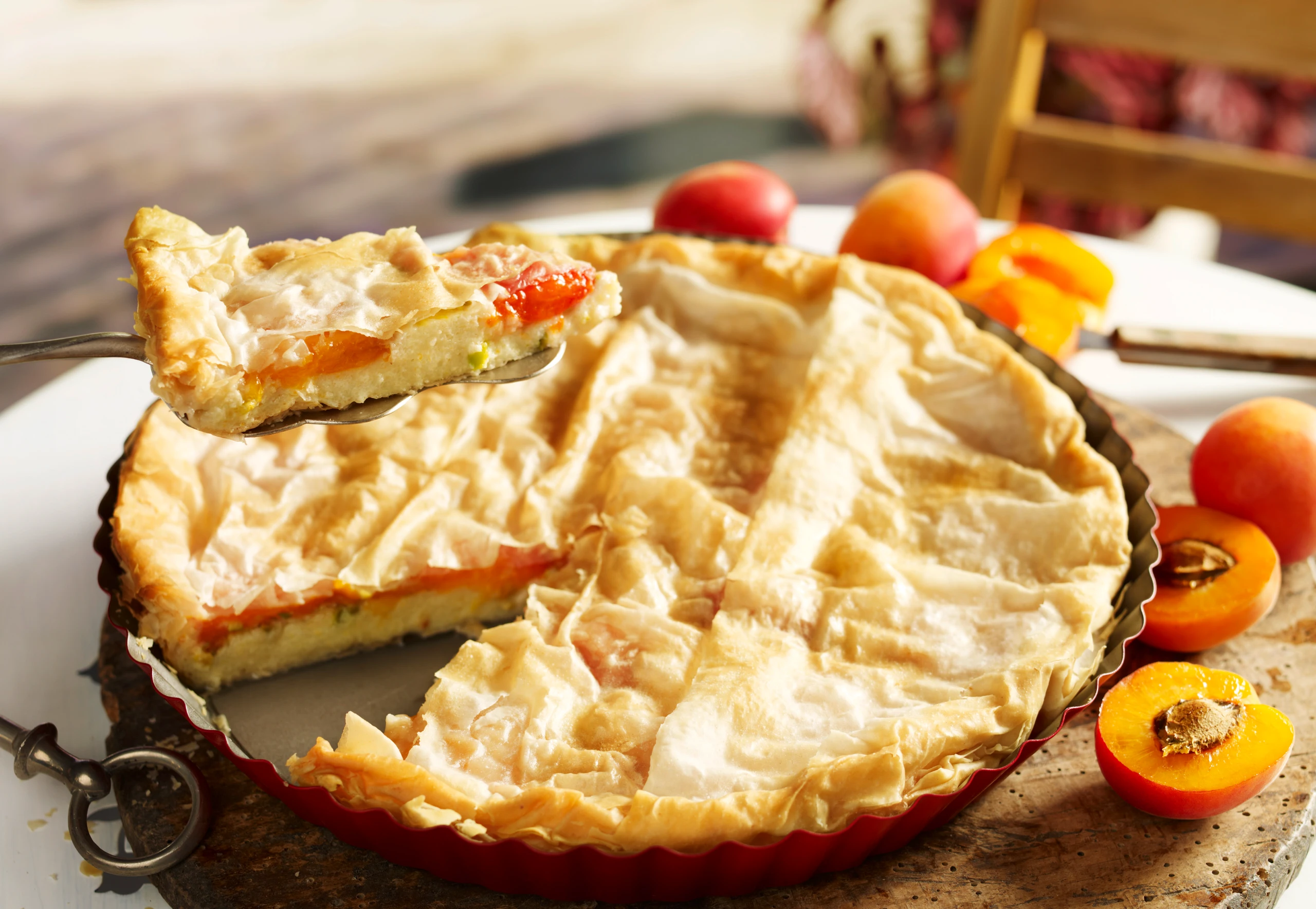 Restliche Teigblätter auf dem feuchten Tuch nacheinander mit Butter bestreichen und auf die Form legen, überstehenden Rand bis auf 1,5 cm wegschneiden. Teigränder nach außen umfalten und in die Form stecken. Marillen-Pita im Rohr (mittlere Schiene / Gitterrost) ca. 45 Minuten backen.