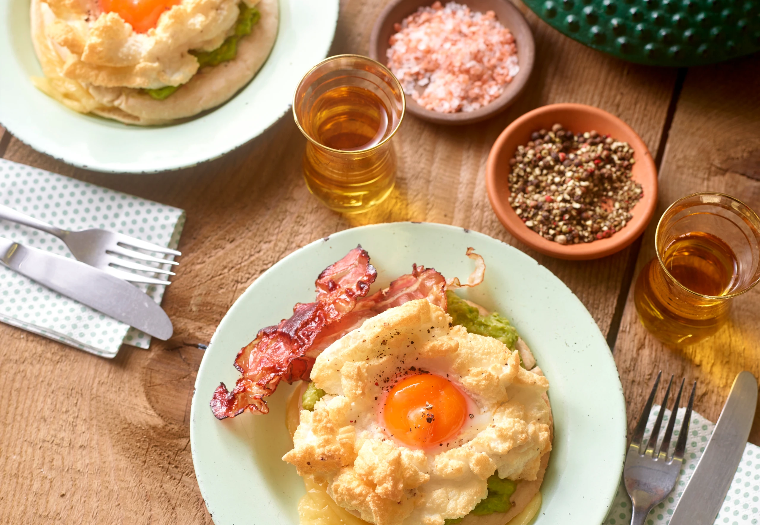 Pita-Pizzen mit Avocado und Cloud Eggs