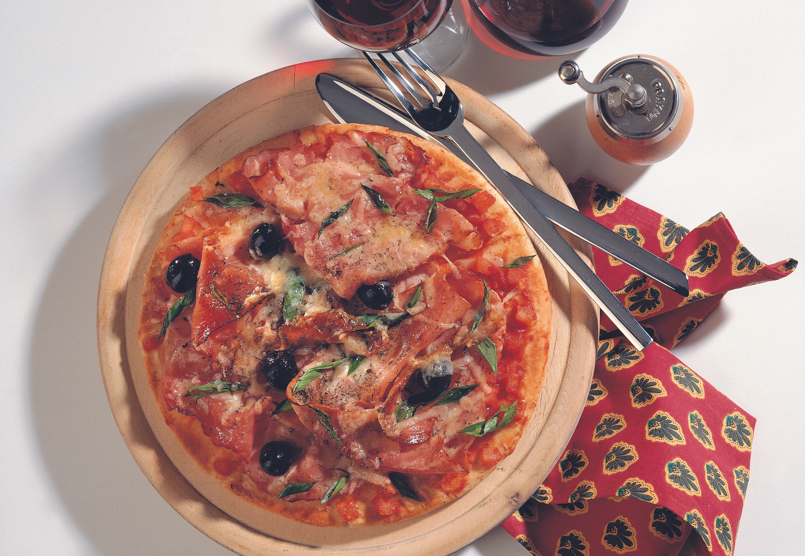 Pizzaböden mit der Paradeismischung bestreichen, mit Schinken und Oliven belegen (ca. 1 cm Rand freilassen) und mit Käse und Jungzwiebelgrün bestreuen. Pizzen mit Salz, Pfeffer, Oregano würzen und mit wenig Öl beträufeln.