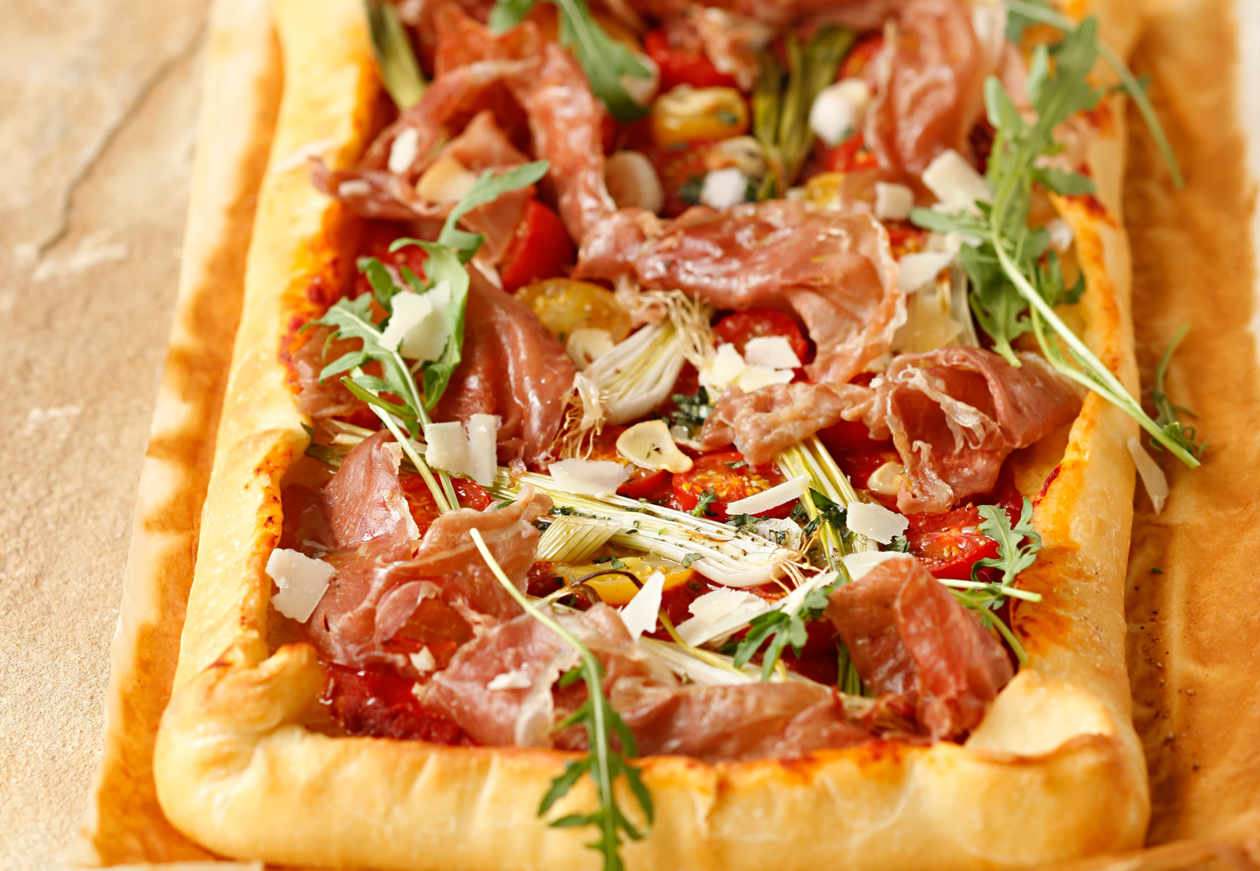 Knoblauch schälen und blättrig schneiden. Paradeiser halbieren, Jungzwiebeln putzen und längs halbieren. Pizza mit Knoblauch, Paradeisern, Zwiebeln und Schinken belegen. Den Rand mit Öl bestreichen.