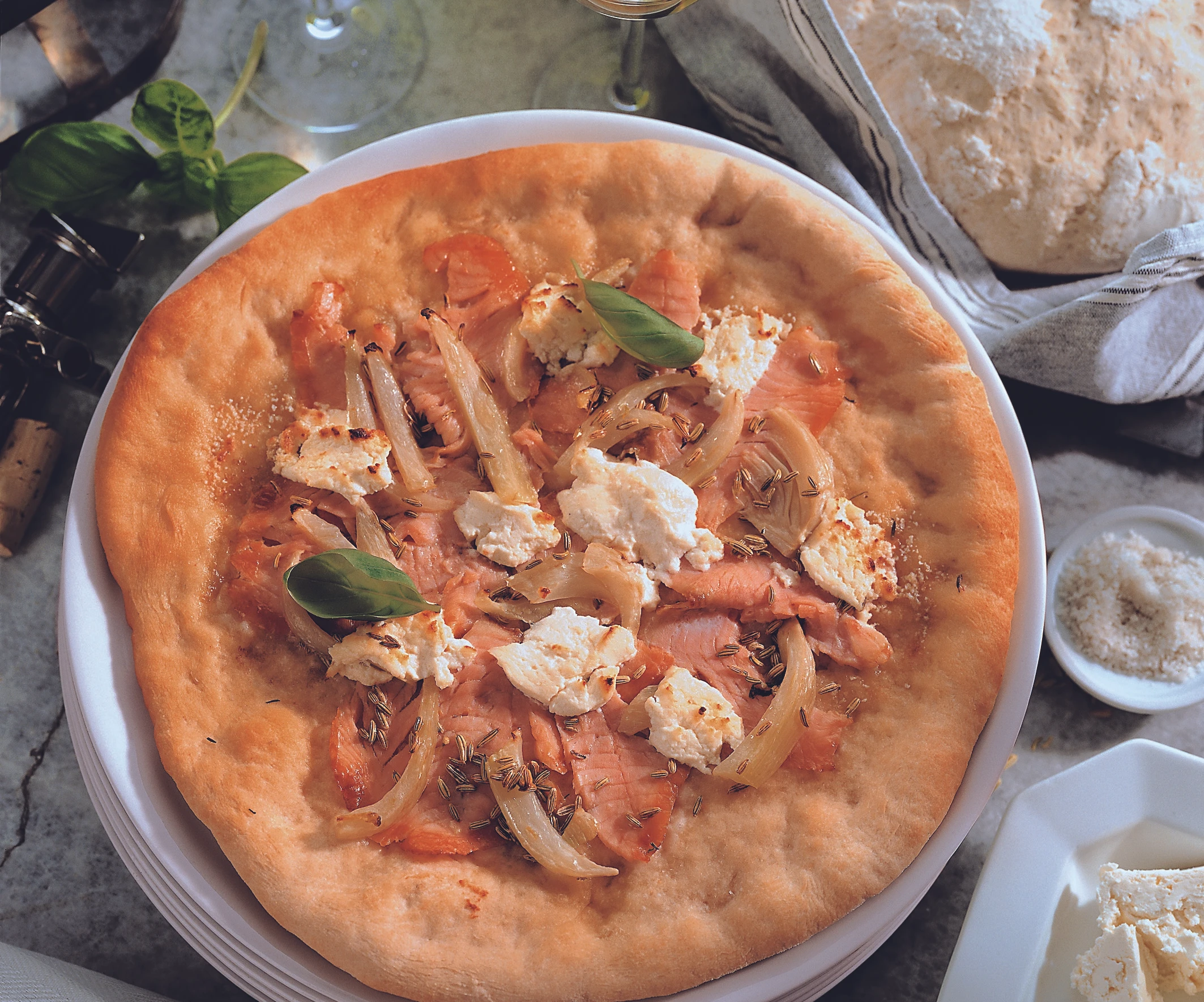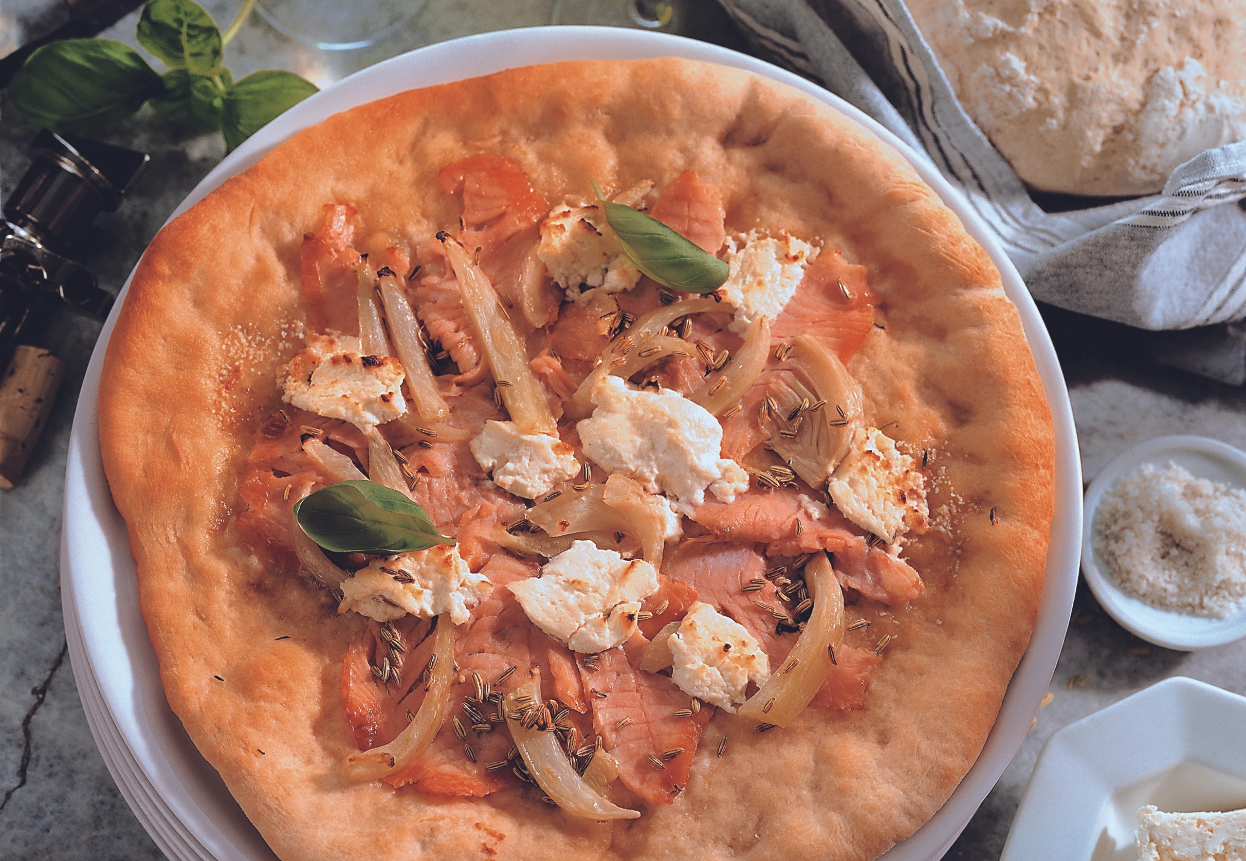 Pizza mit Räucherlachs, Fenchel und Robiola