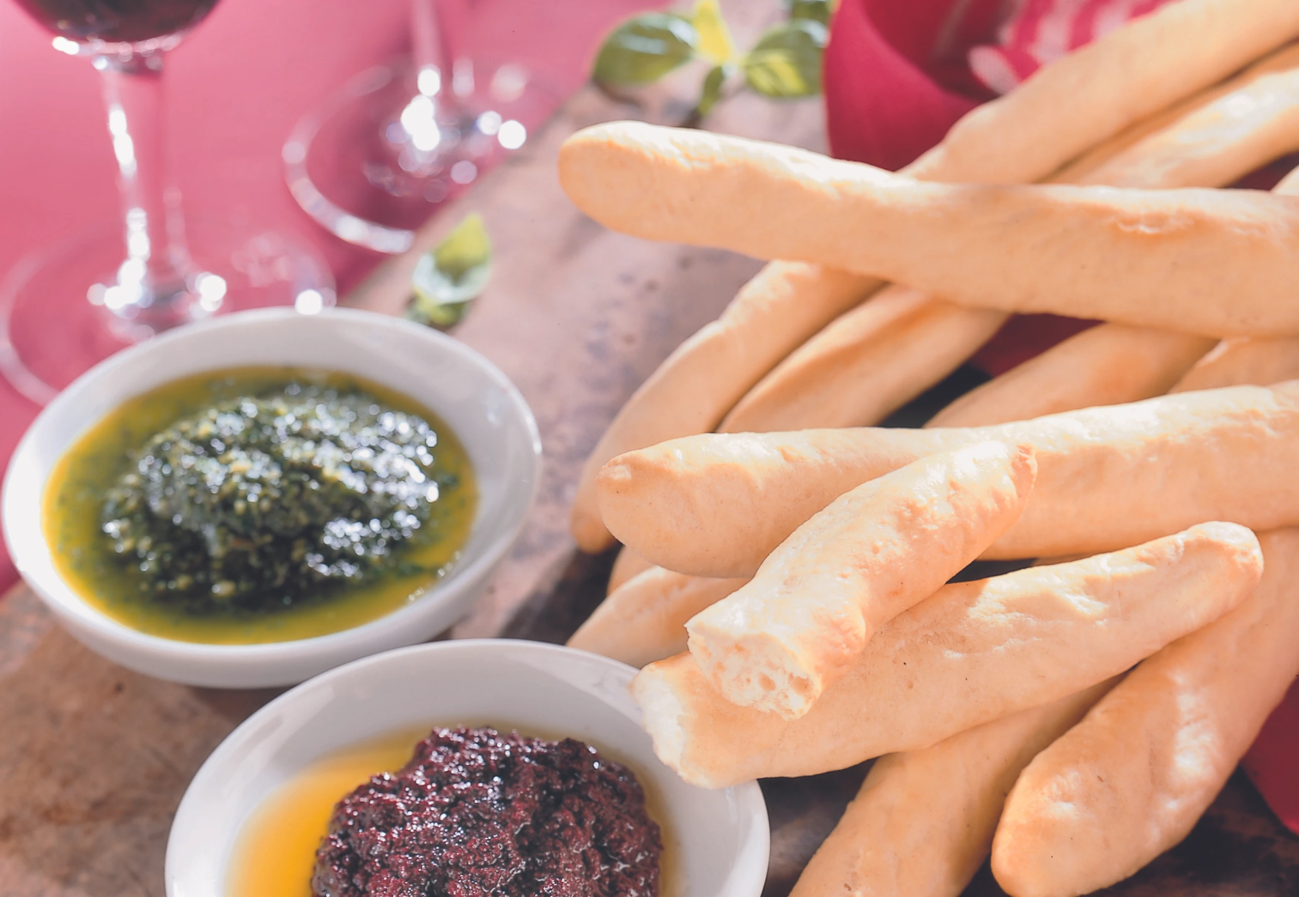 Pizzastangerl mit Olivenpesto und Basilikumpesto