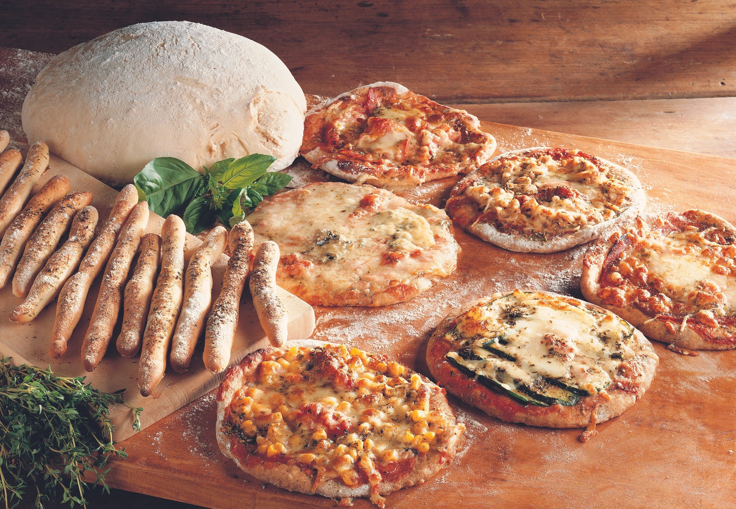 Teigstangen auf das Backblech legen, mit Wasser bestreichen, evtl. mit Pizzagewürz bestreuen und mit Mehl bestauben. Stangerln im vorgeheizten Rohr (mittlere Schiene) 8–10 Minuten knusprig braun backen.