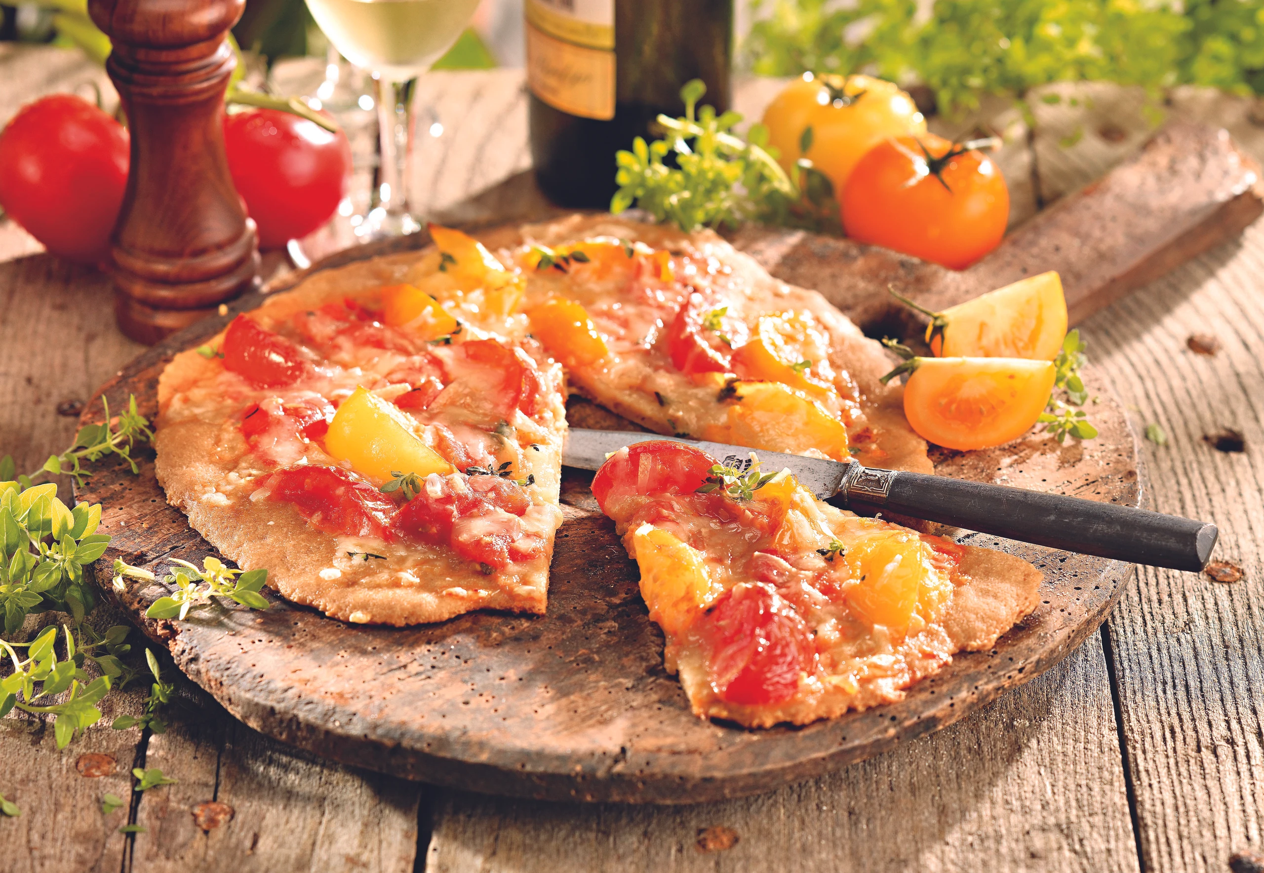 Rohr auf 200°C vorheizen. Teig auf Backpapier legen und mit dem bemehlten Nudelwalker zu ca. 4 mm dicken Scheiben ausrollen. Paradeiser darauf verteilen, salzen, pfeffern, mit etwas Öl beträufeln, mit Käse und Basilikum bestreuen.
