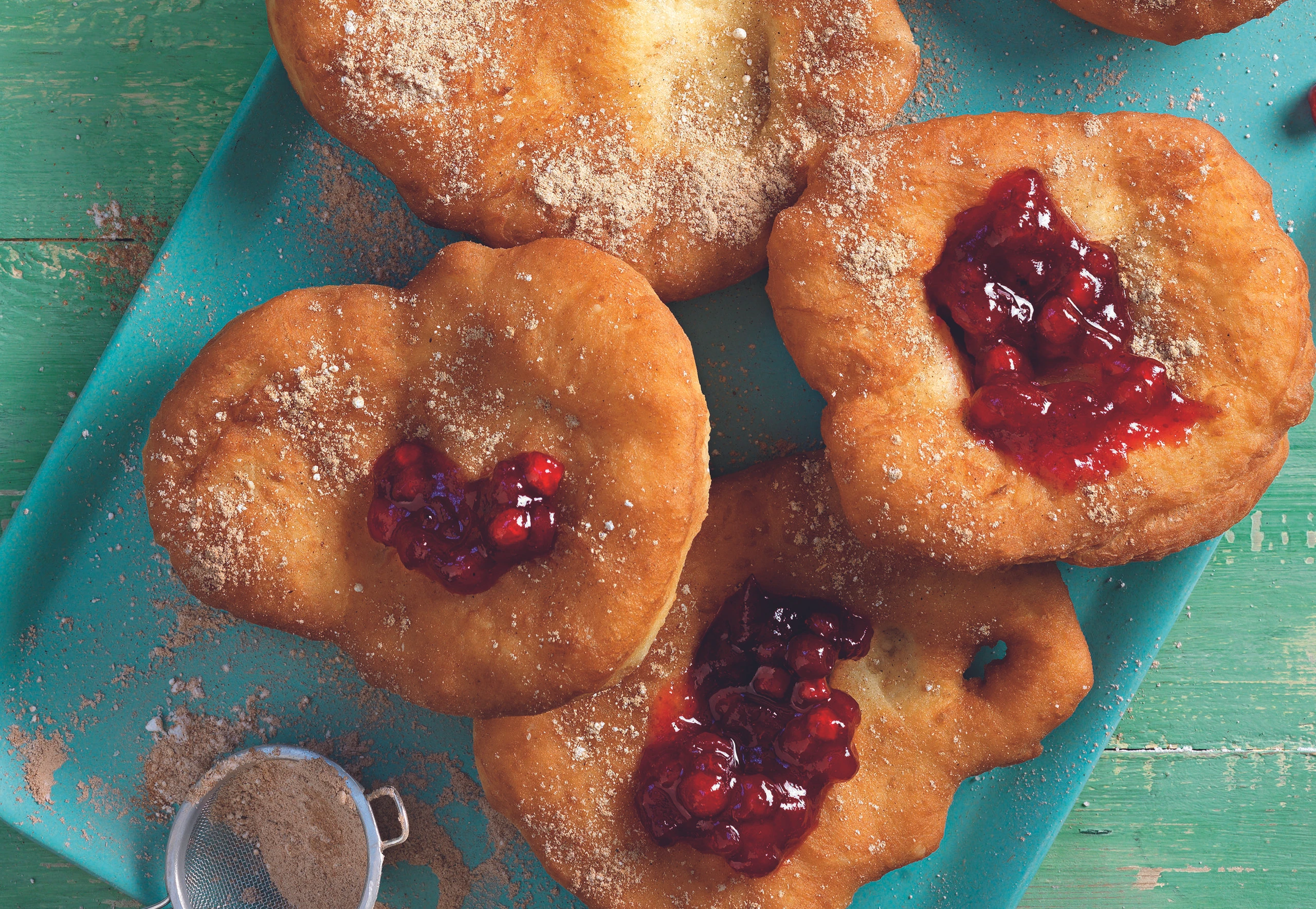 Ca. 4 Finger hoch Öl auf 170°C erhitzen. Teigstücke mit der Oberseite nach unten ins Öl legen, zugedeckt ca. 2 Minuten anbacken, wenden und ca. 2 Minuten offen fertig backen. Platzeln mit einem Gitterlöffel herausheben, gut abtropfen lassen und auf Küchenpapier trocken tupfen. Staubzucker mit wenig Zimt vermischen. Platzeln mit Zimtzucker bestreuen und mit Marmelade gefüllt servieren.