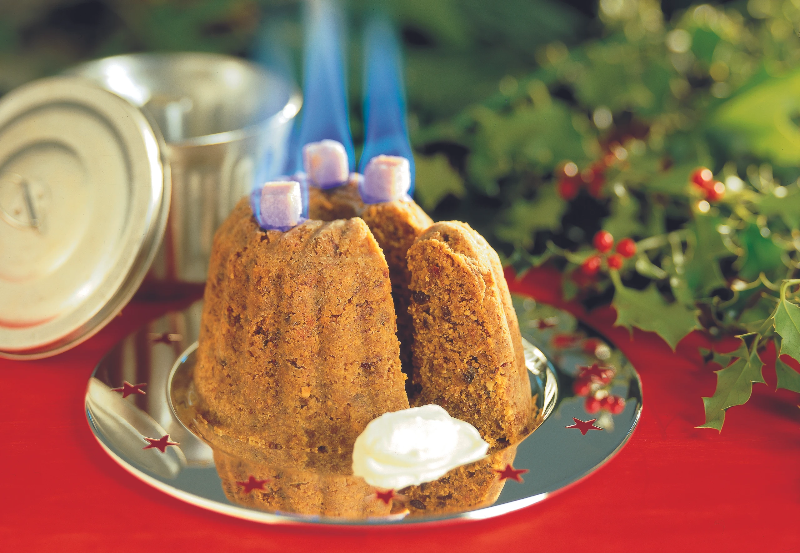 Pudding auf eine Anrichteplatte stürzen und mit Zuckerwürfeln belegen. Zuerst die Zuckerwürfel, dann den Pudding mit Rum beträufeln, entzünden und rasch zu Tisch bringen. Pudding mit Weinsabayon, Vanillesauce und/oder Rumbutter servieren.
